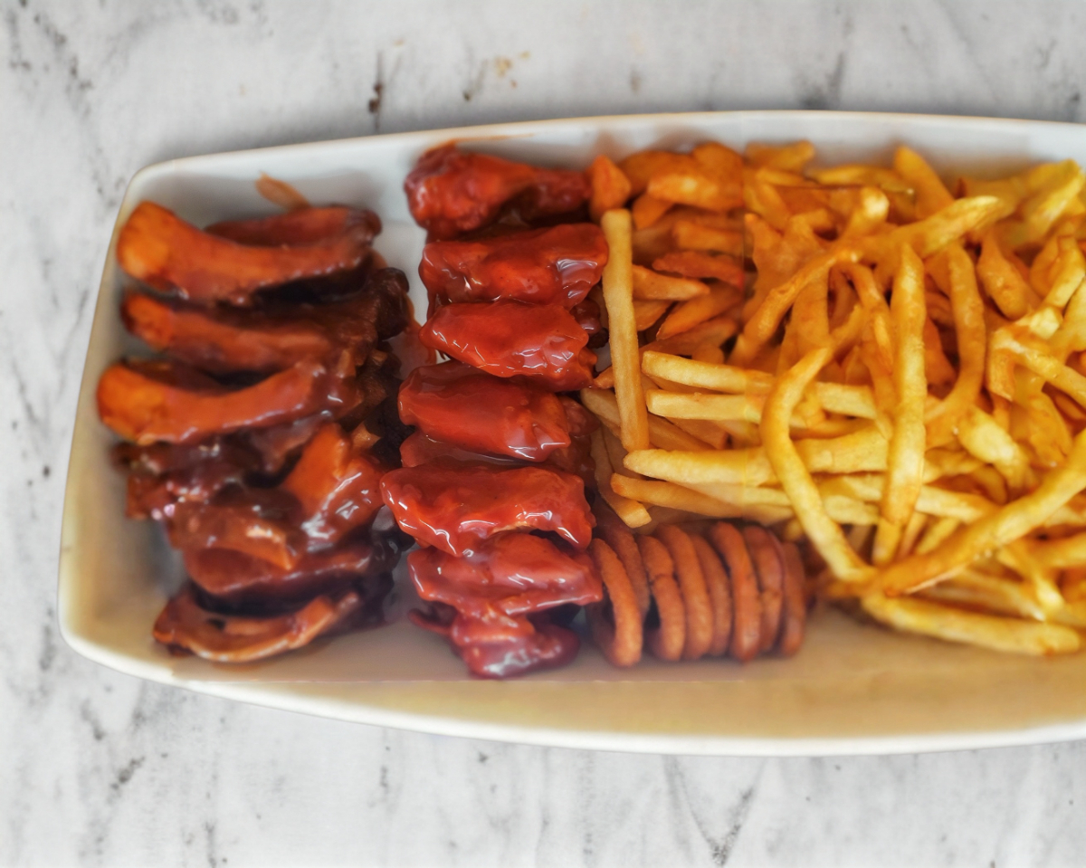 900 grs de Costilla.*1 + 24 Alitas.*1 + 150 grs de Papas Francesas.*1 + 150 grs de Papas Gajo.*1 + 12 Aros de Cebolla.*1