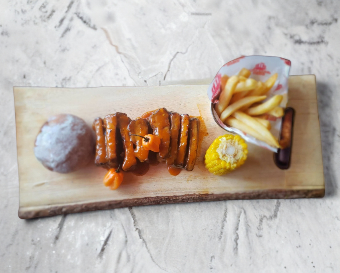 900grs de Costilla de puerco ahumada bañada en salsa bbq con 130grs de papas francesas, 130grs de papas gajo y 3 medios elotes