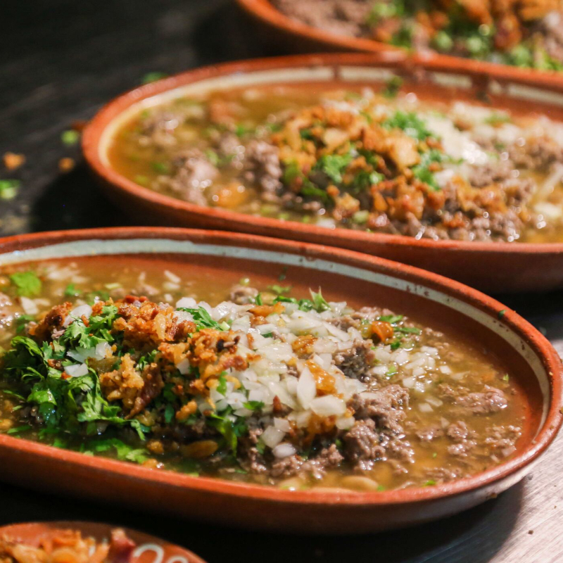 1 Litro de deliciosa carne de res en su jugo acompañada de frijoles, salseado en una mezcla de chile chiltepin y tomates asados. Complementos: Tortillas, nopales, cebolla, cilantro y limones.
