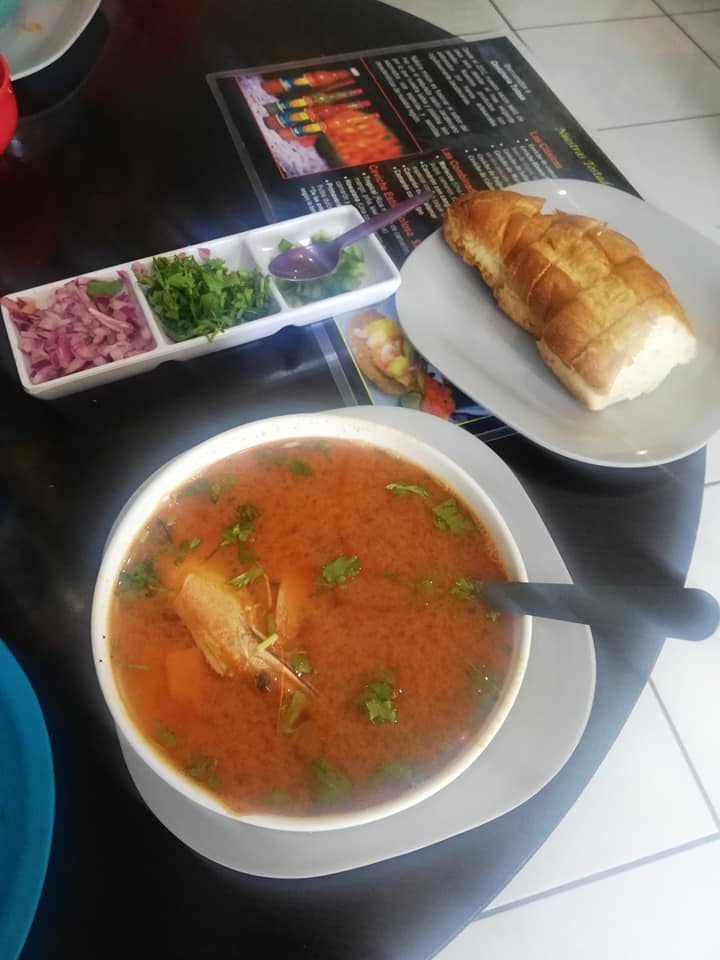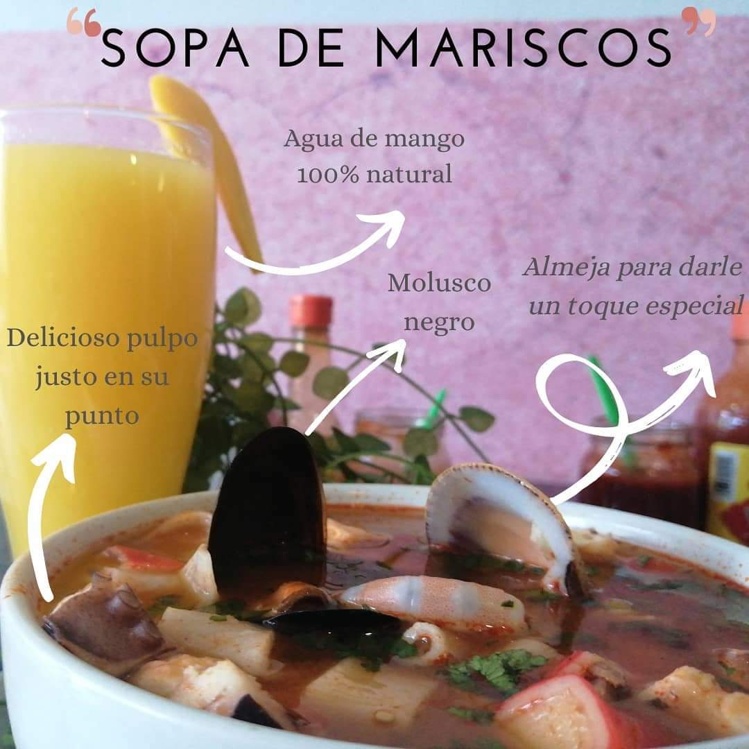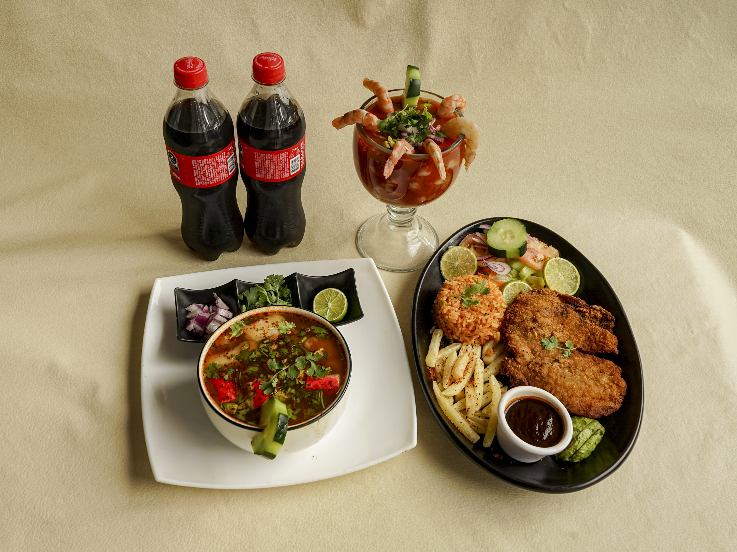 1 Sopa de mariscos, 1 filete empanizado, 1 cóctel mediano de camarón, 2 refrescos a elegir.