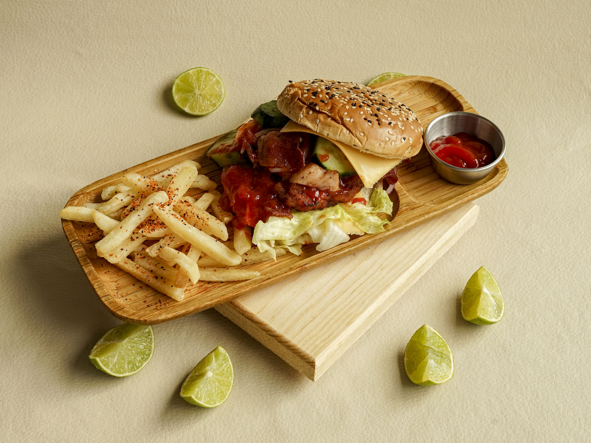 (250 a 300 Gr)Filete Empanizado, arroz, verduras, papas ala francesa 70Gr, mas las salsa