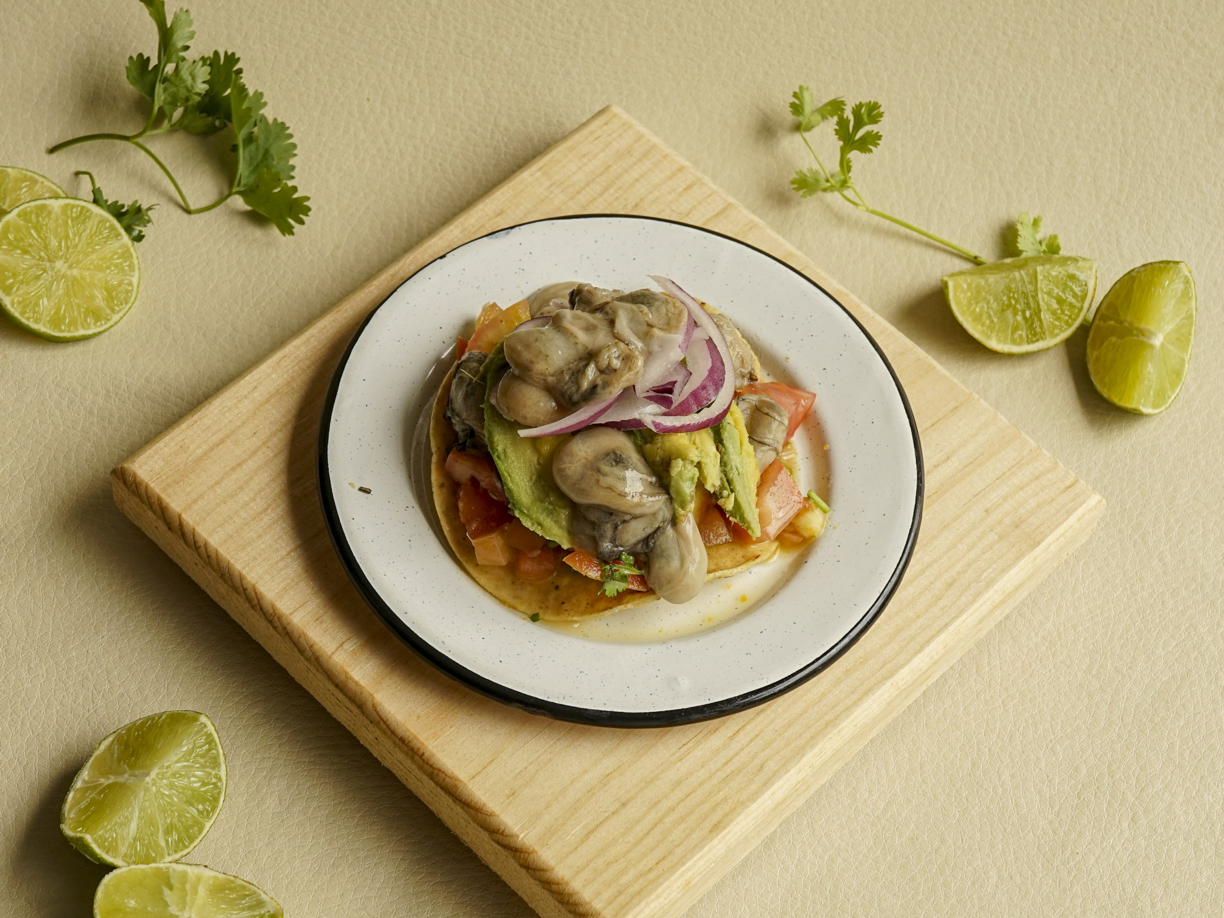 Camarón, pulpo y ostión. Acompañado de cilantro, cebolla y aguacate.