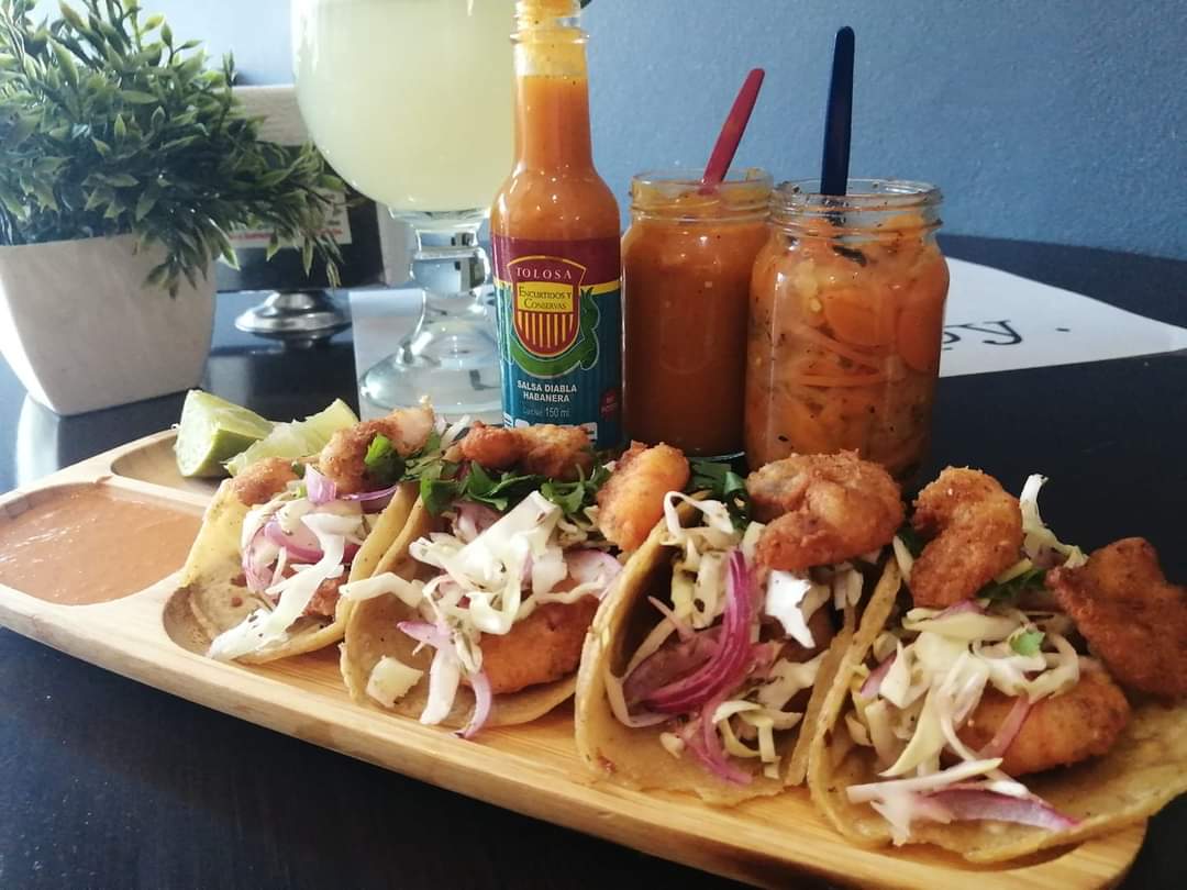 Orden de 4 tacos con pescado empanizados, se acompañan con repollo, cebolla morada y cilantro.
