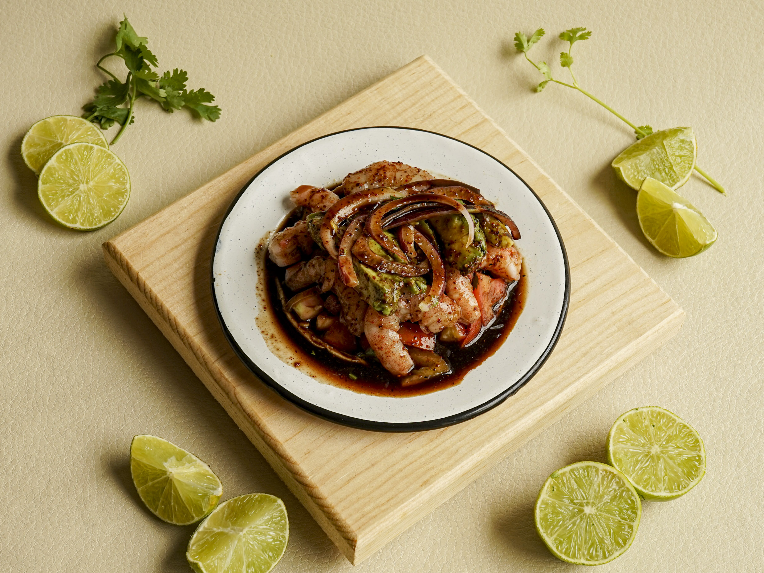 Camarón y calamar en adobo de chiles rojos incluye aguacate, cebolla morada, limones y salsa de la casa.