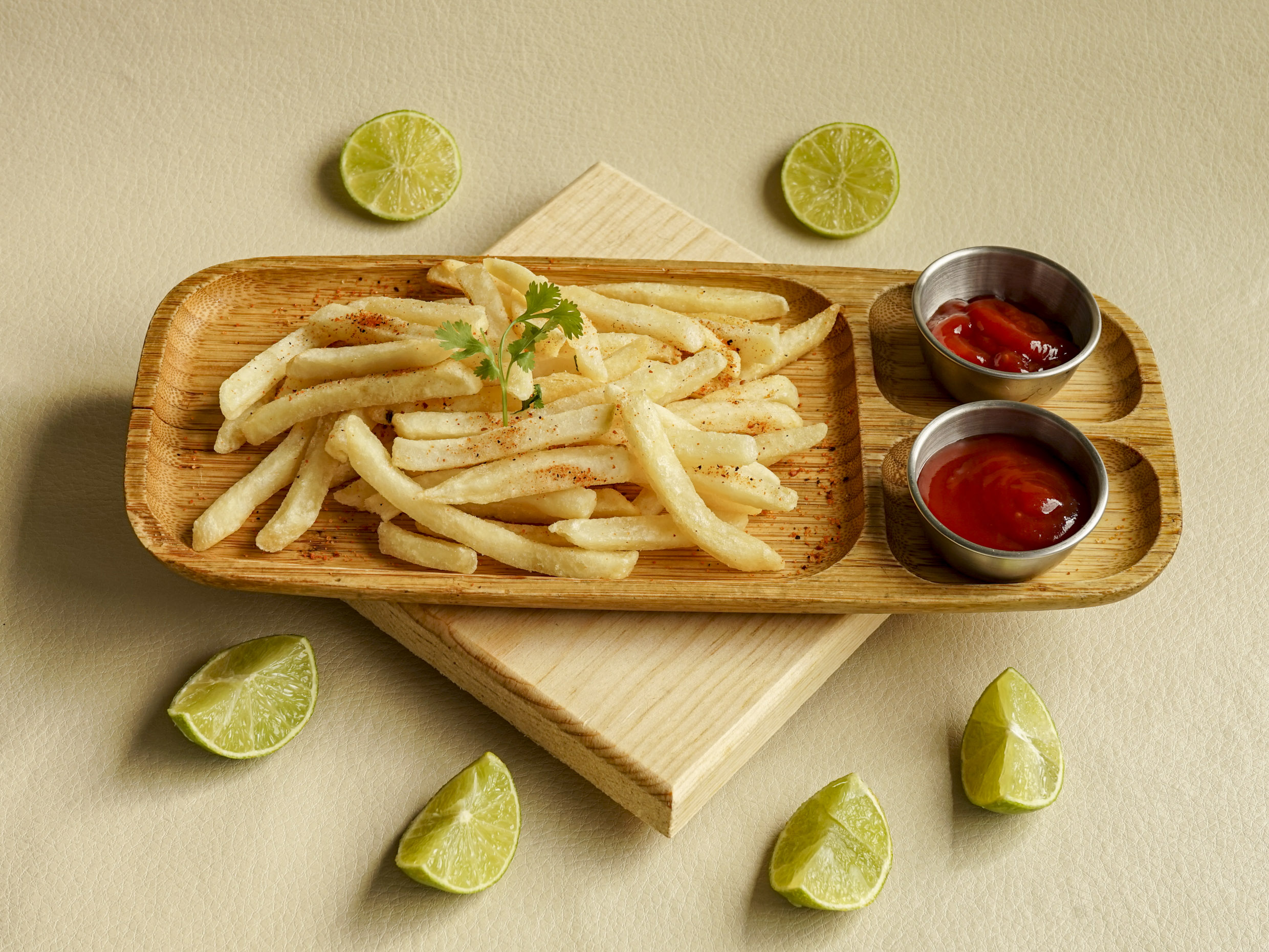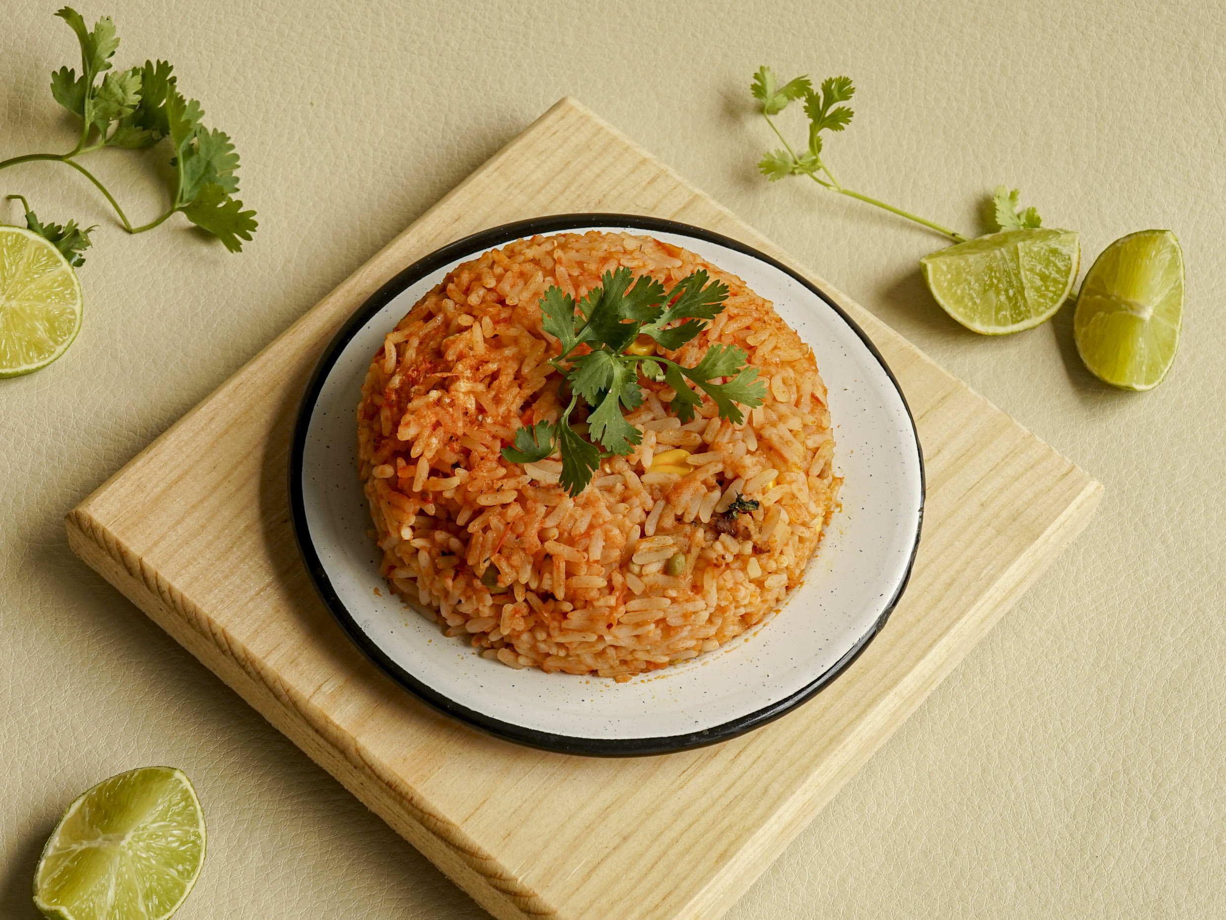 Camarones empanizados acompañados de arroz, verduras y papas a la francesa.