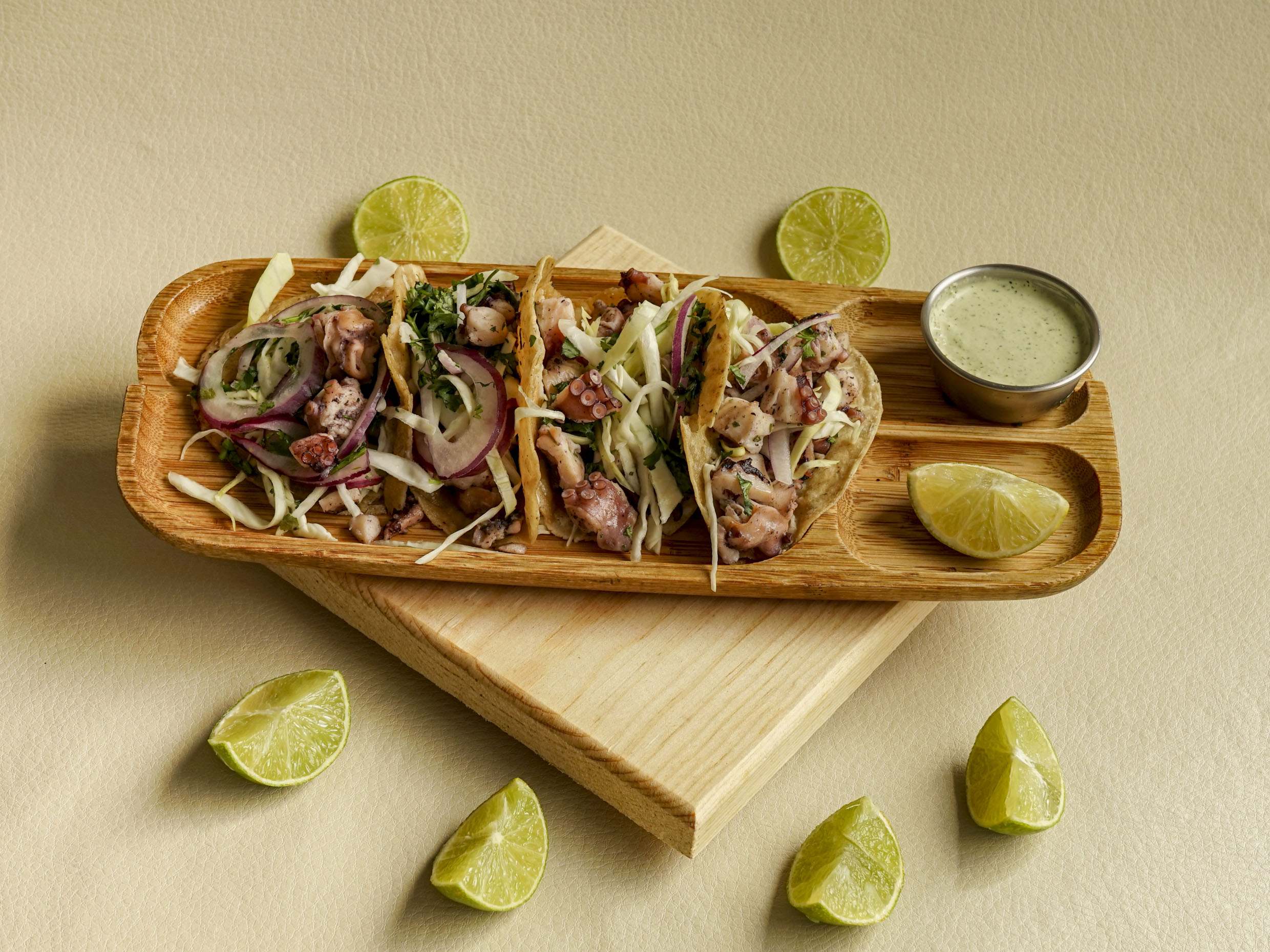 Orden de 4 tacos con pulpo en trocitos, se acompañan con repollo, cebolla morada y cilantro.