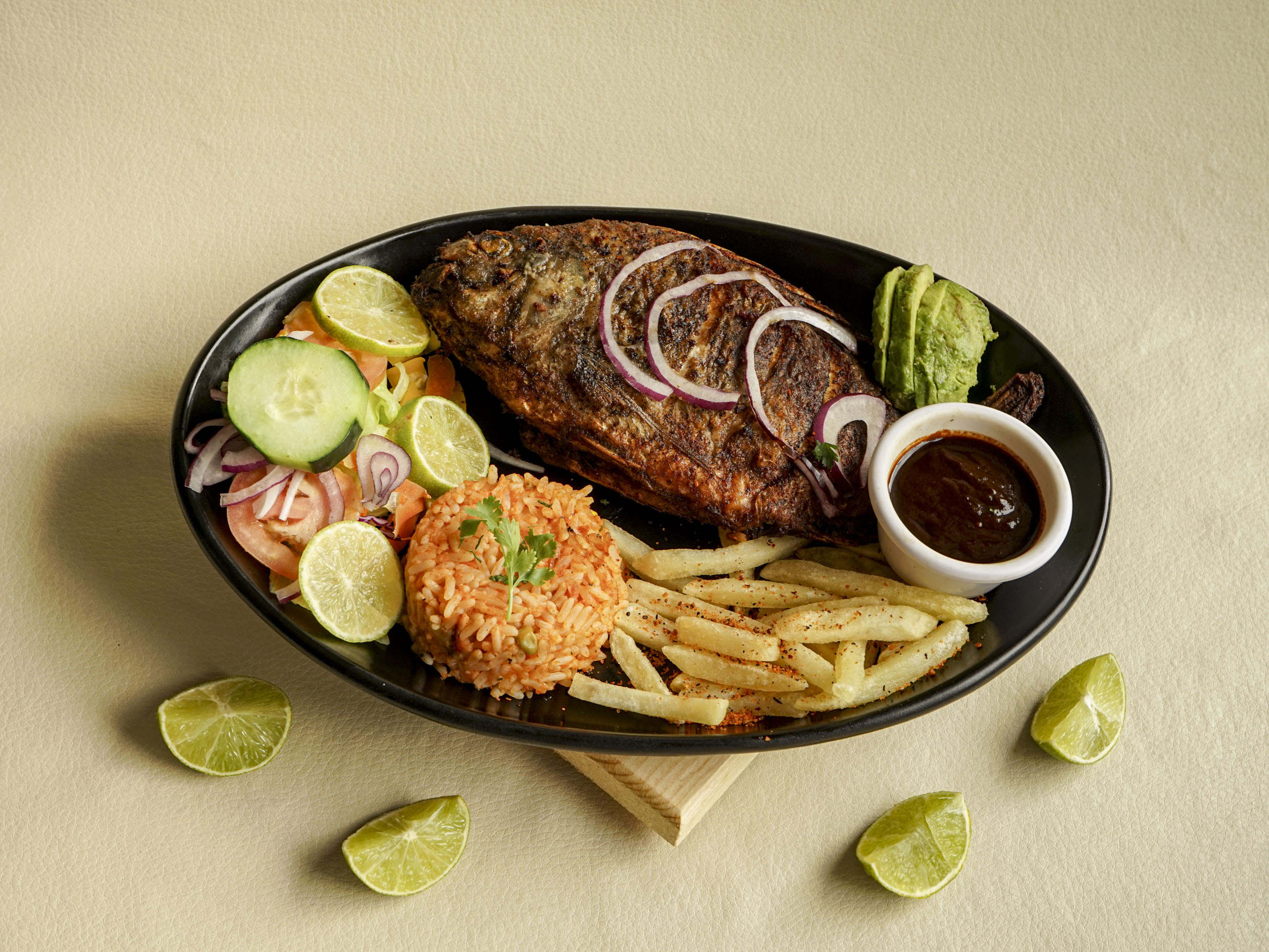 Rica mojarra frita acompañada de arroz, papas a la francesa y verdura.