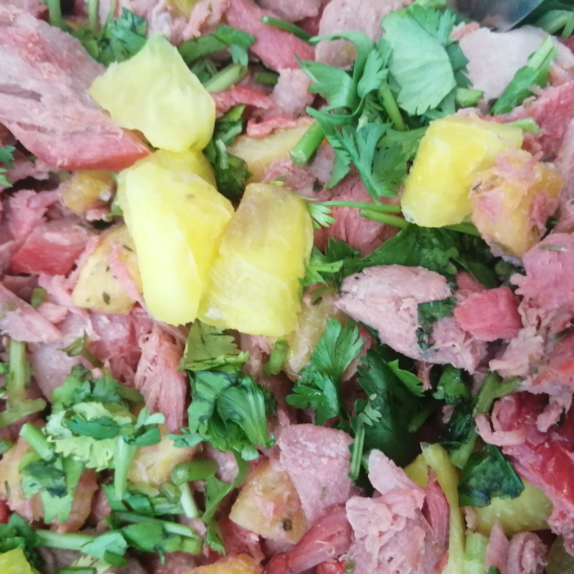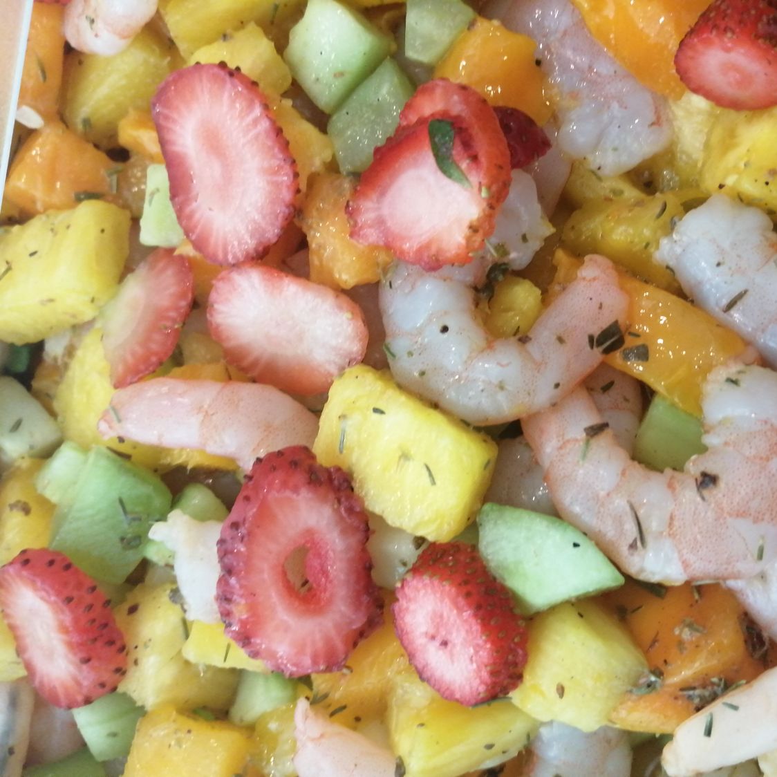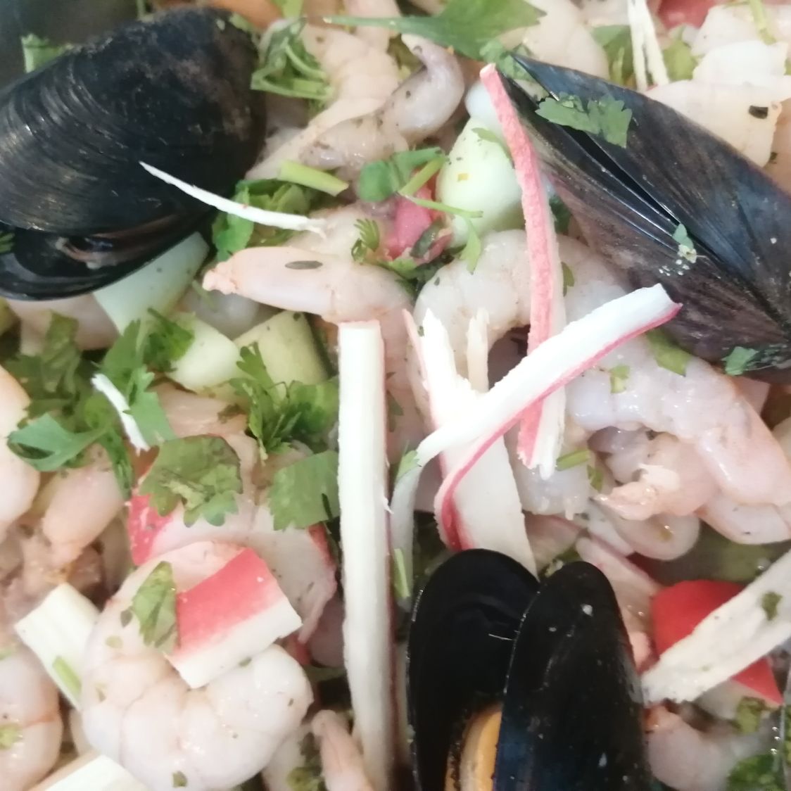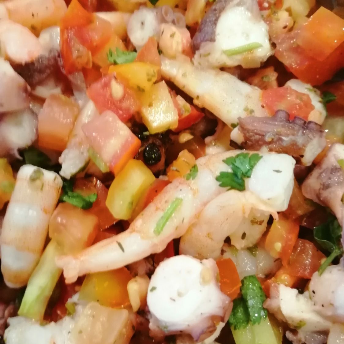 camaron, pulpo, piña, lechuga, pepino, aguacate, cebolla morada