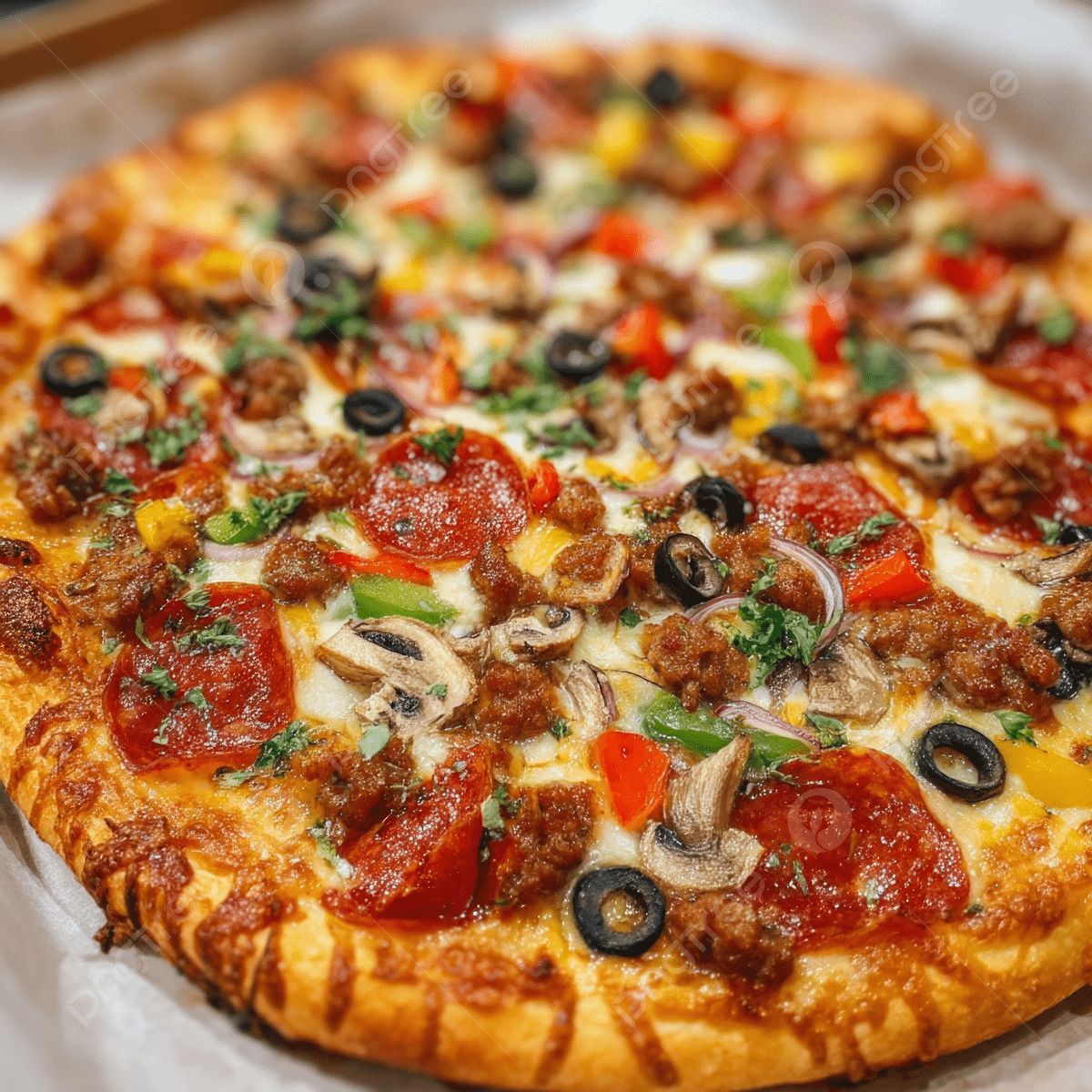 Deliciosa pizza artesanal con pepperoni, jamón, salchicha y chorizo