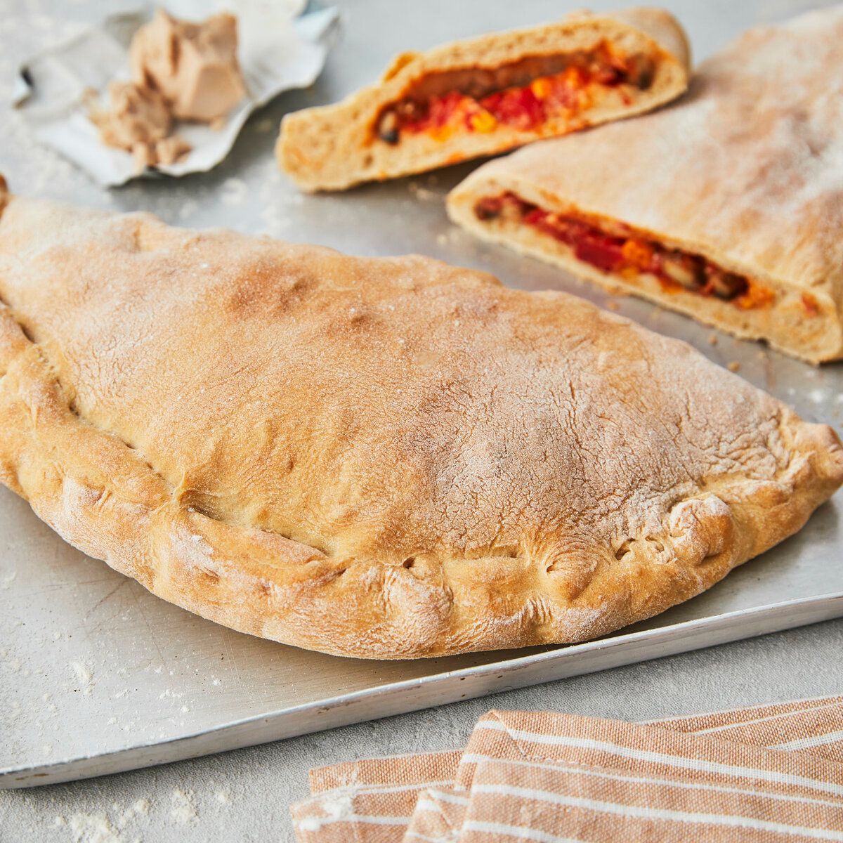 Pizza italiana doblada y rellena con pepperoni, jamón, salchicha, chorizo, pimiento cebolla y jalapeño