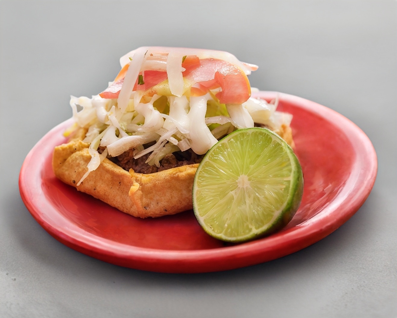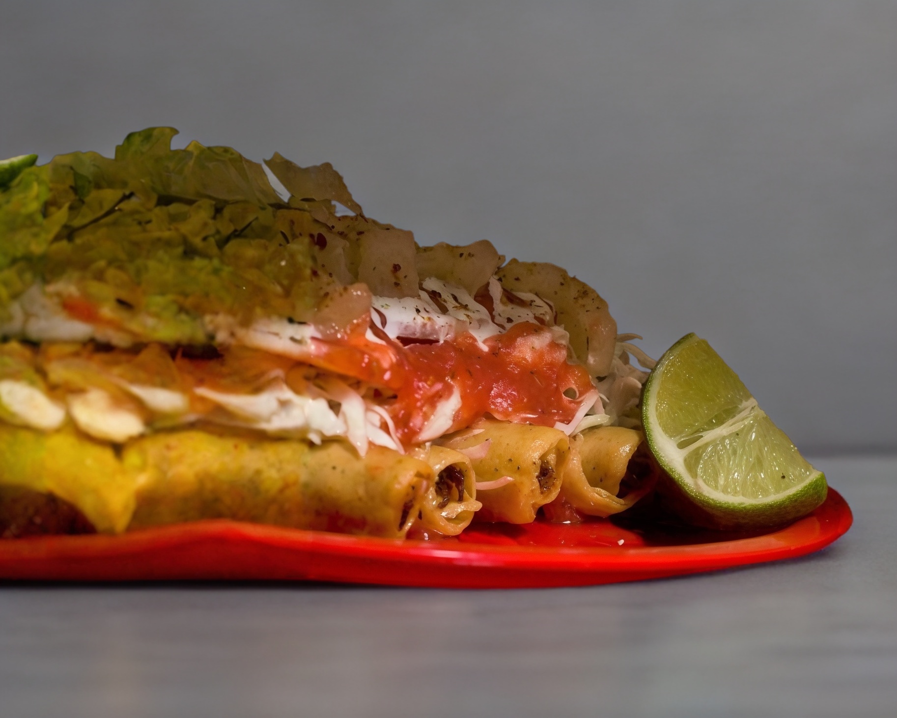 5 flautas de deshebrada o chicharrón prensado, acompañadas de repollo, jitomate, cebolla, cueritos, salsa de tomate y crema