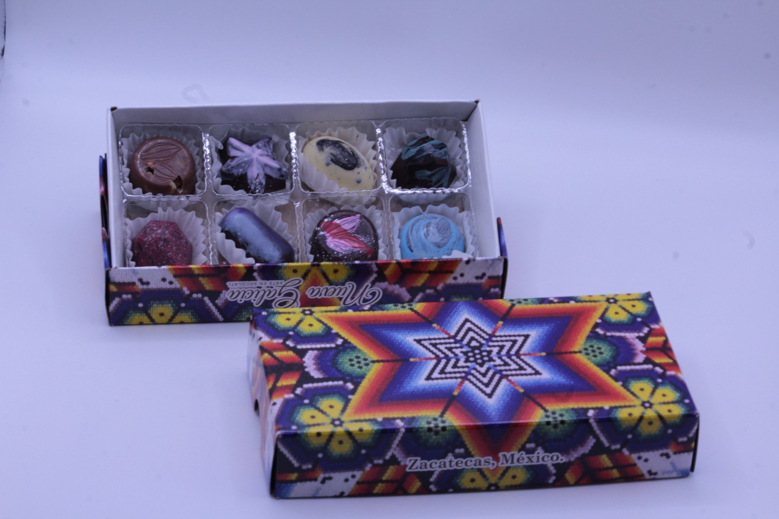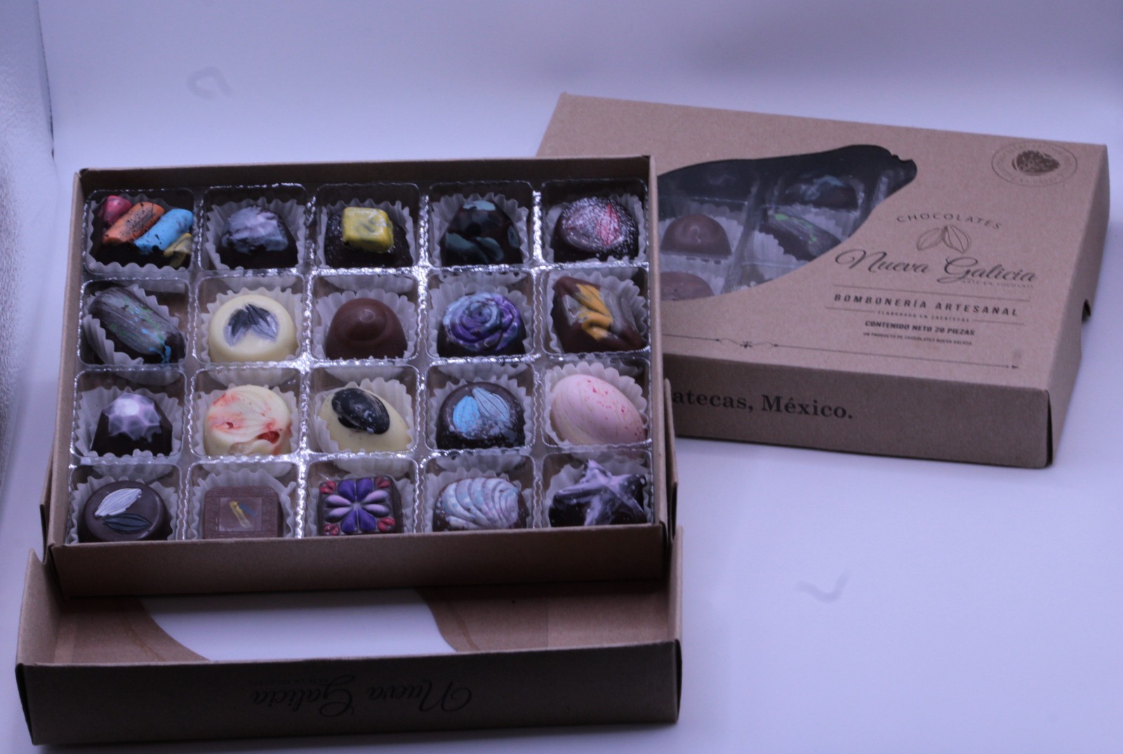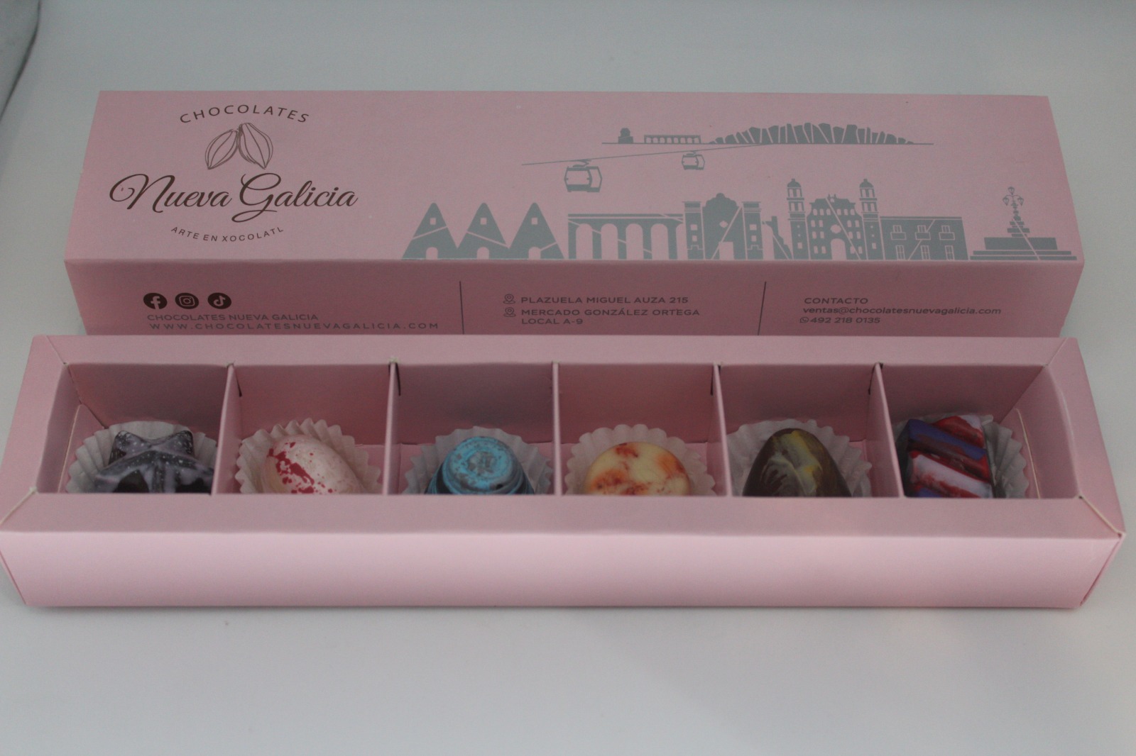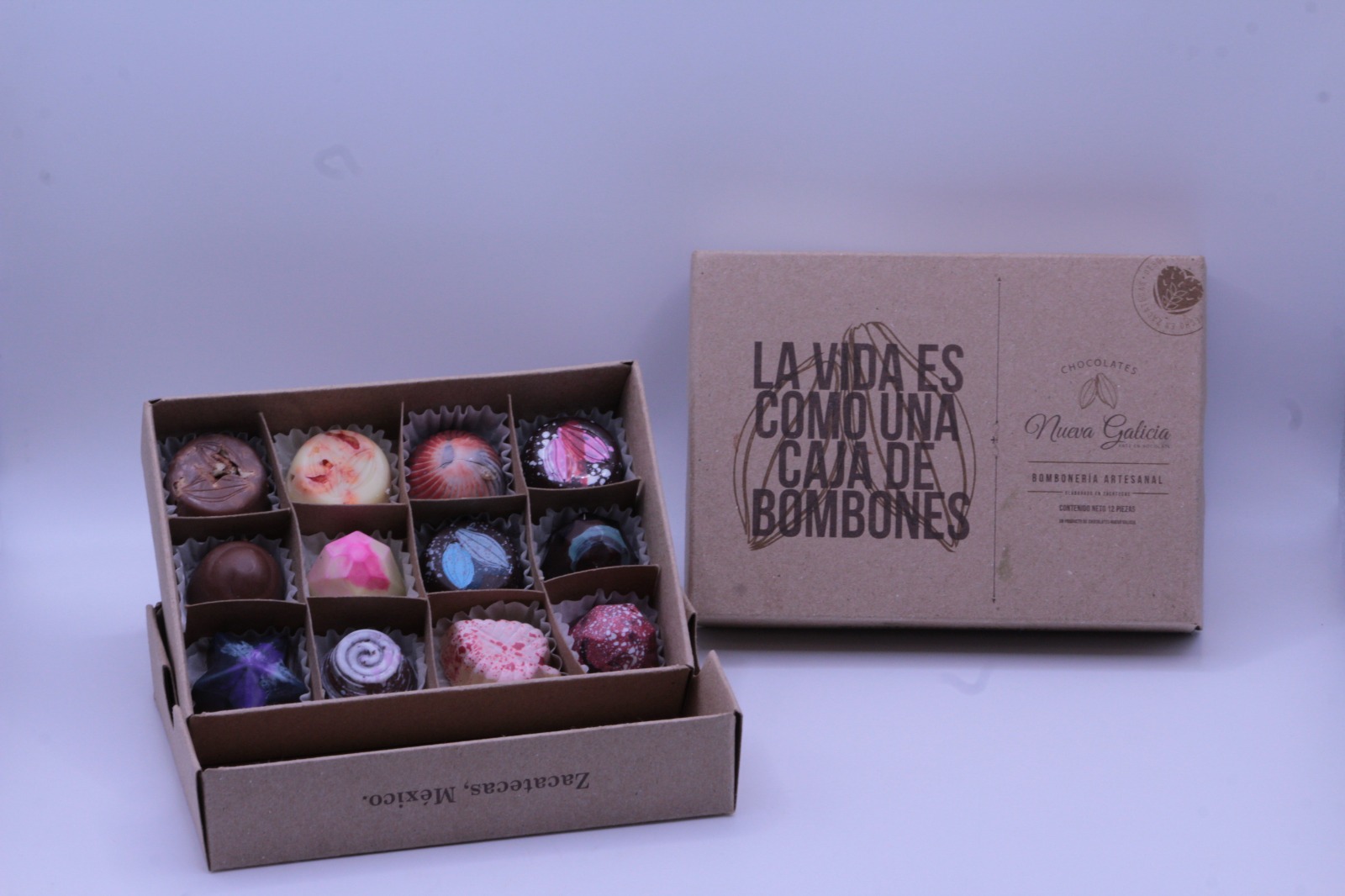 Incluye: Caja con 12 chocolates, jalea artesanal Nueva Galicia 250g, 100g café cubierto de chocolate botella de vino tinto 375 mls.