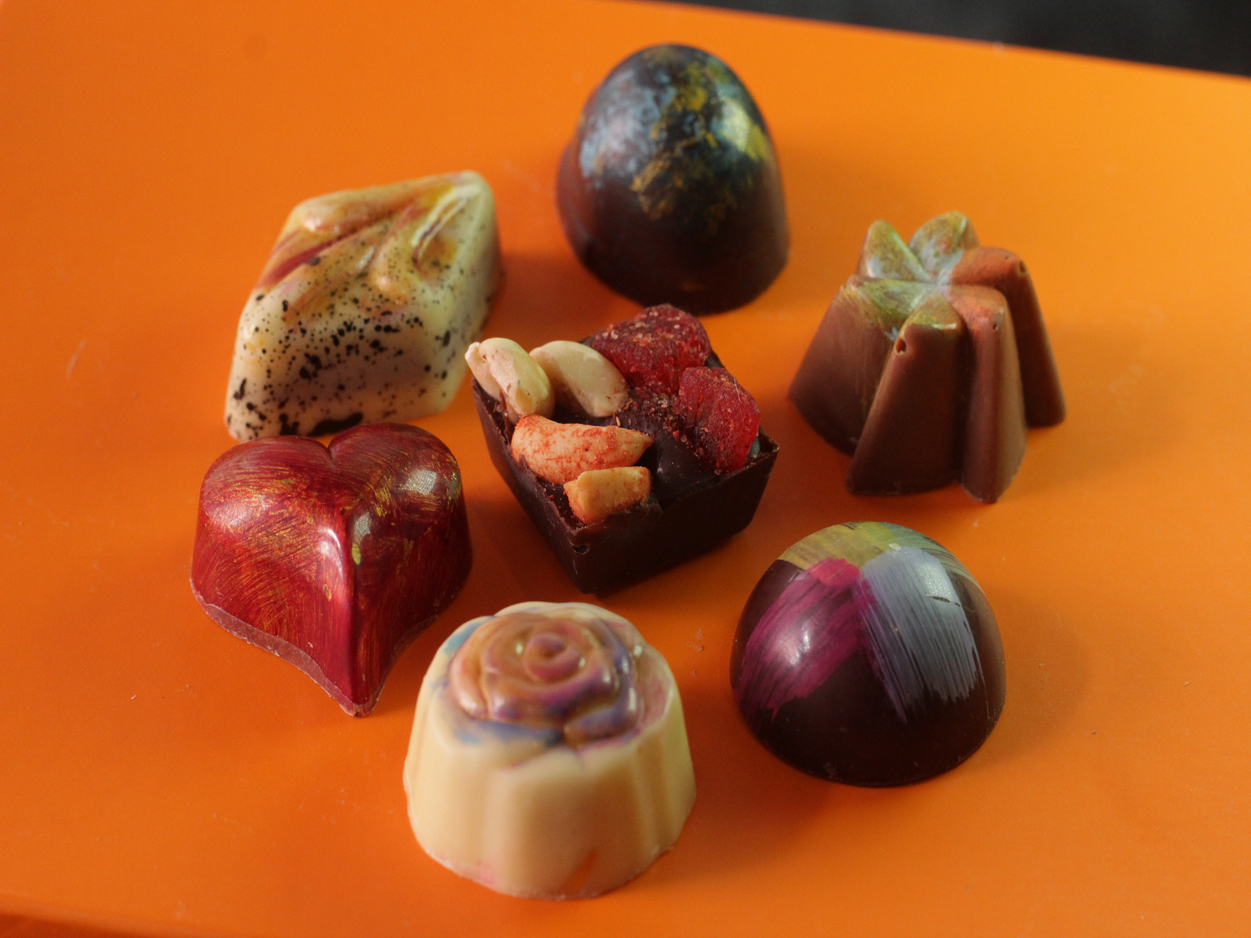 Pan de chocolate semiamargo, jalea de durazno cubierto de ganache de chocolate semiamargo