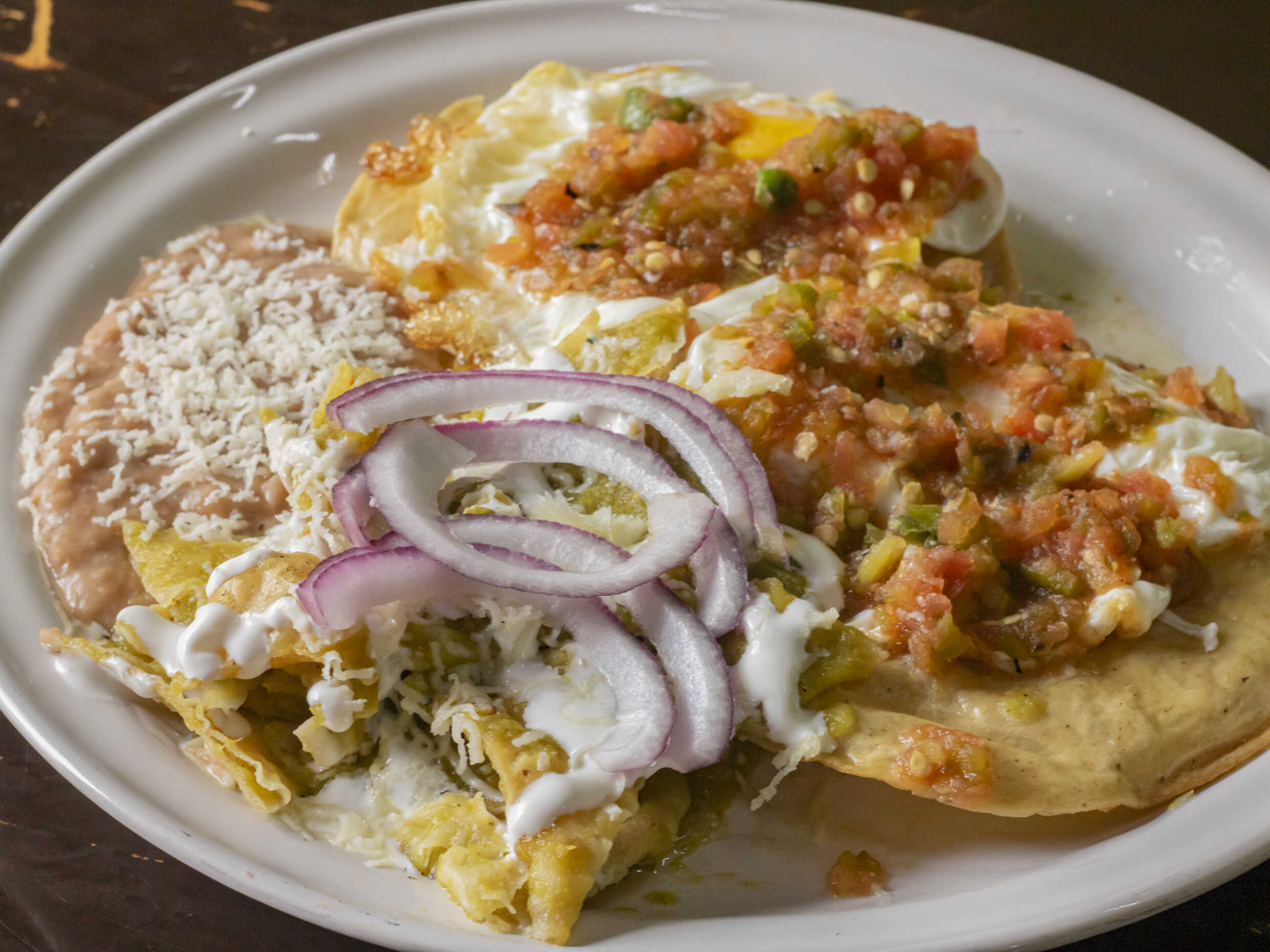 orden de huevos estrellados y chilaquiles verdes. Incluye bolillo, fruta y cafe de olla.