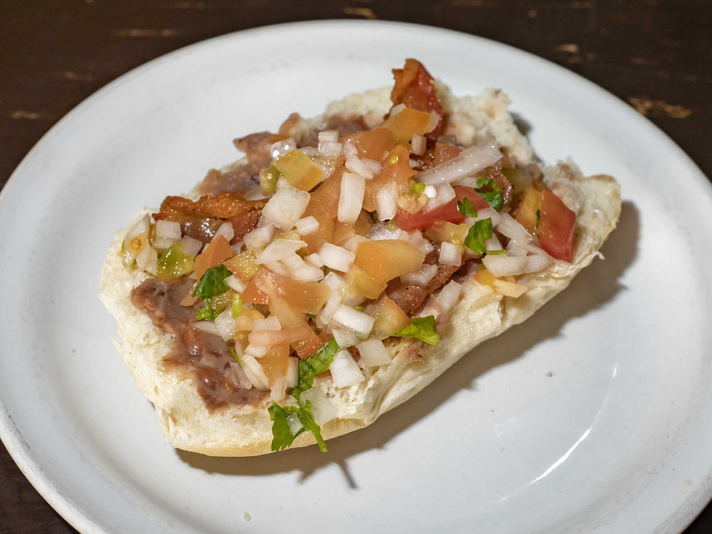 2 piezas de molletes acompañados con frijoles, queso, pico de gallo, tocino