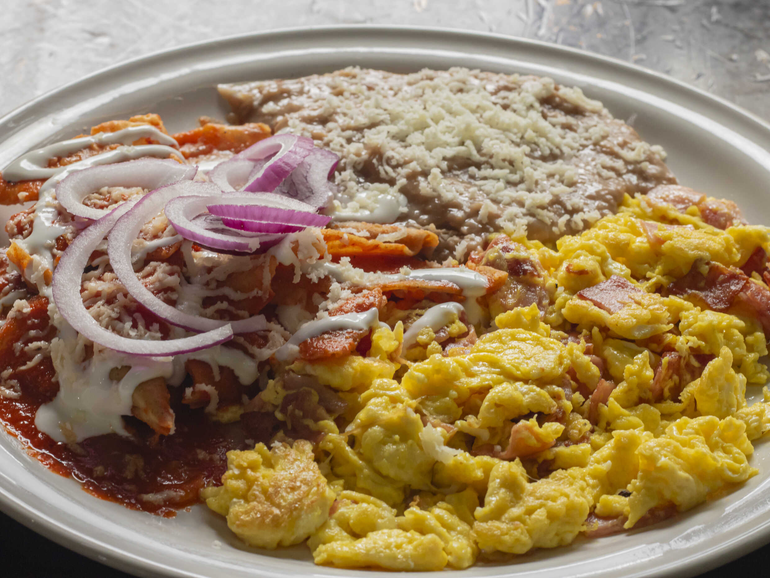 orden de huevo con jamon y chilaquiles. Incluye bolillo, fruta y cafe de olla