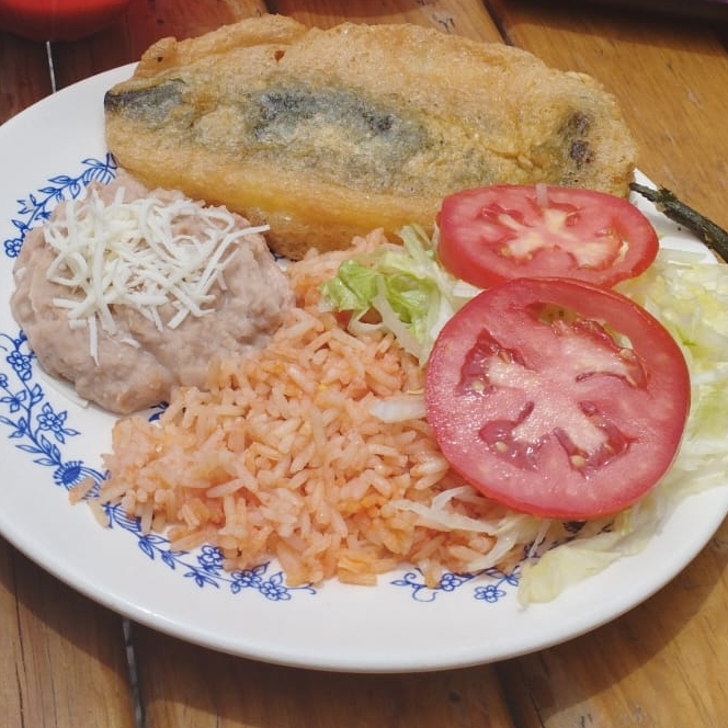 Relleno de queso, acompañado de arroz, frijoles, verdura, opcional su caldillo de tomate
