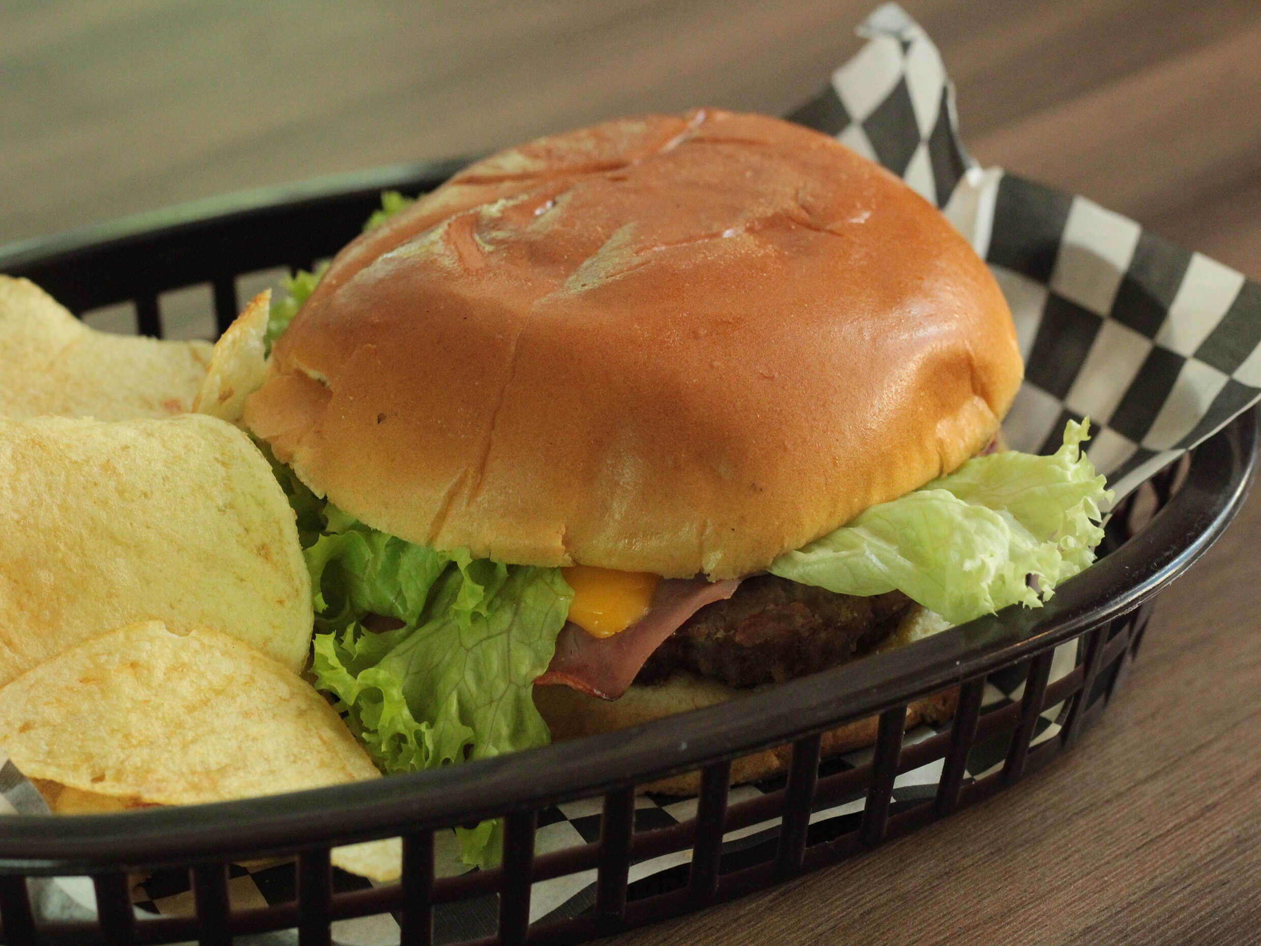 110 gramos de carne, mayonesa de la casa, jamón, queso y vegetales.