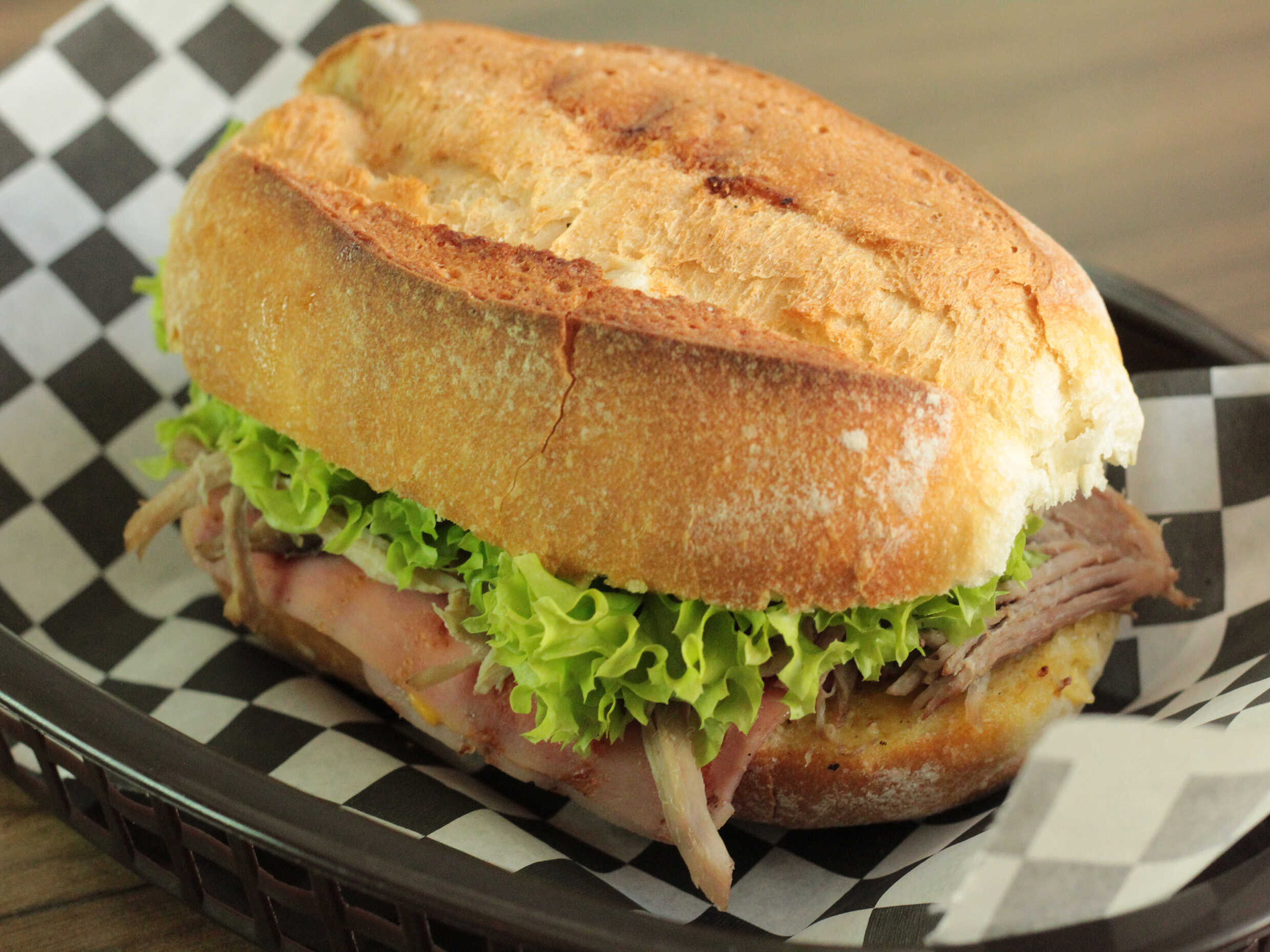 Pierna (reseca de casa), jamón, queso amarillo, aguacate y vegetales.