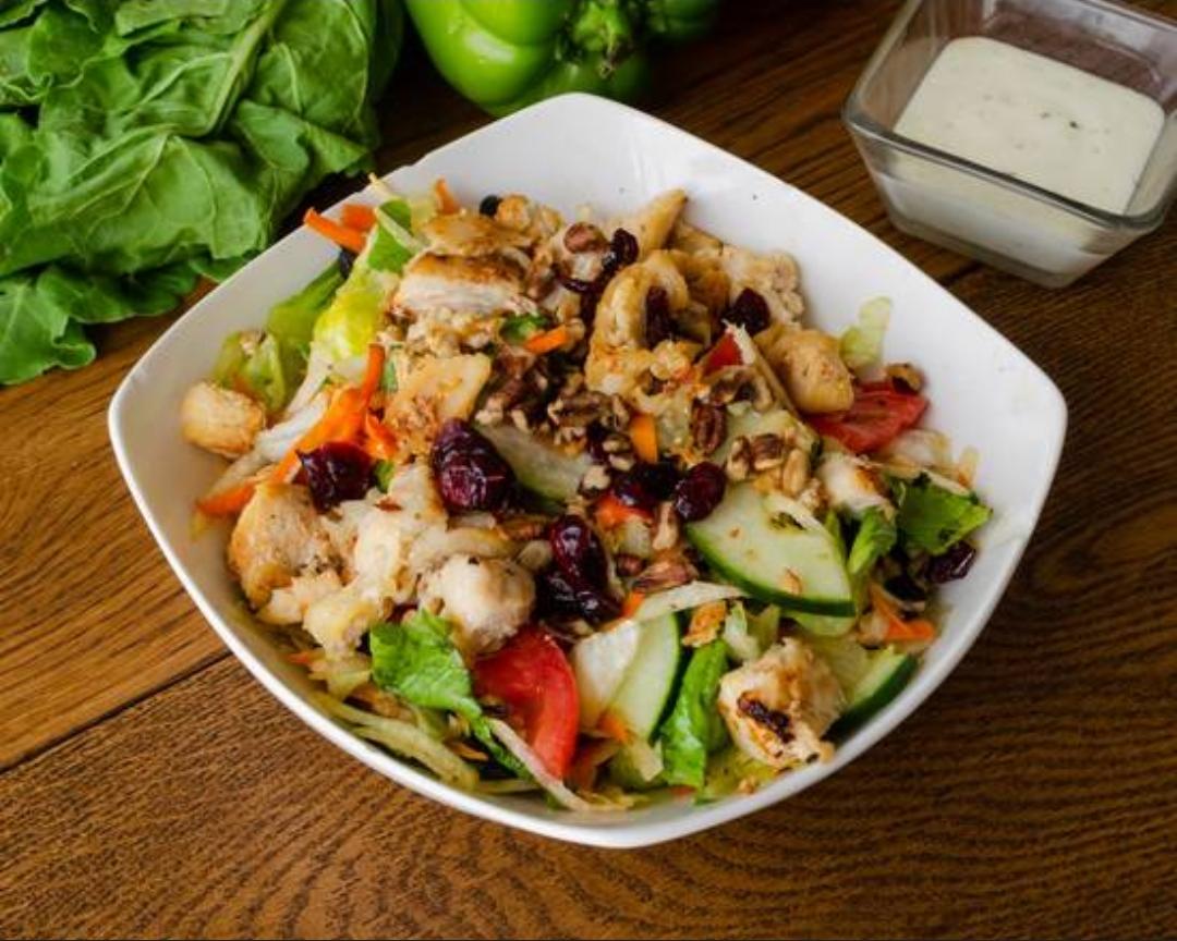 Base de lechuga, con jitomate, pepino, zanahoria, pimiento morrón, nuez y árandanos, con una porción de pollo de 100 gramos.
