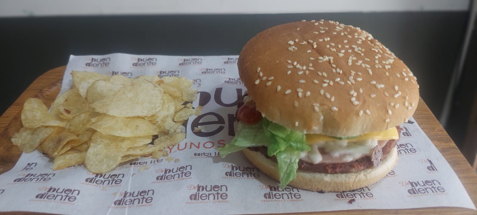 Hamburguesa con queso asadero, 1 carne de res, jitomate, cátsup, lechuga, acompañada con una porción de ensalada. Incluye chiles.
