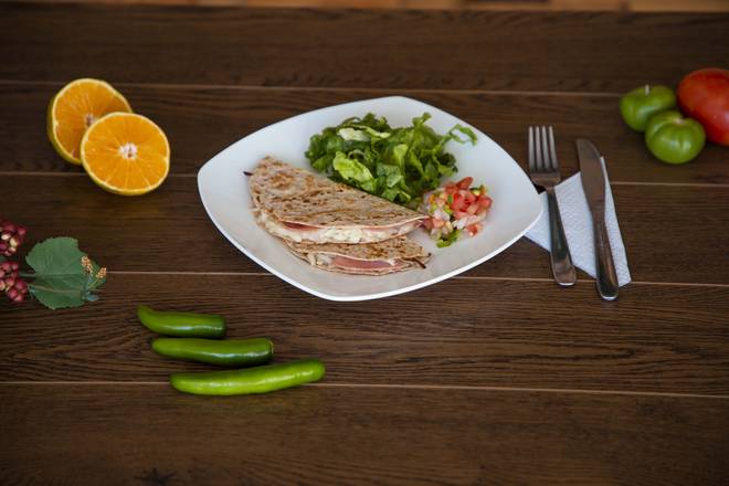 Tortilla de harina con queso, jamón de pavo, acompañado de lechuga, pico de gallo y aguacate.