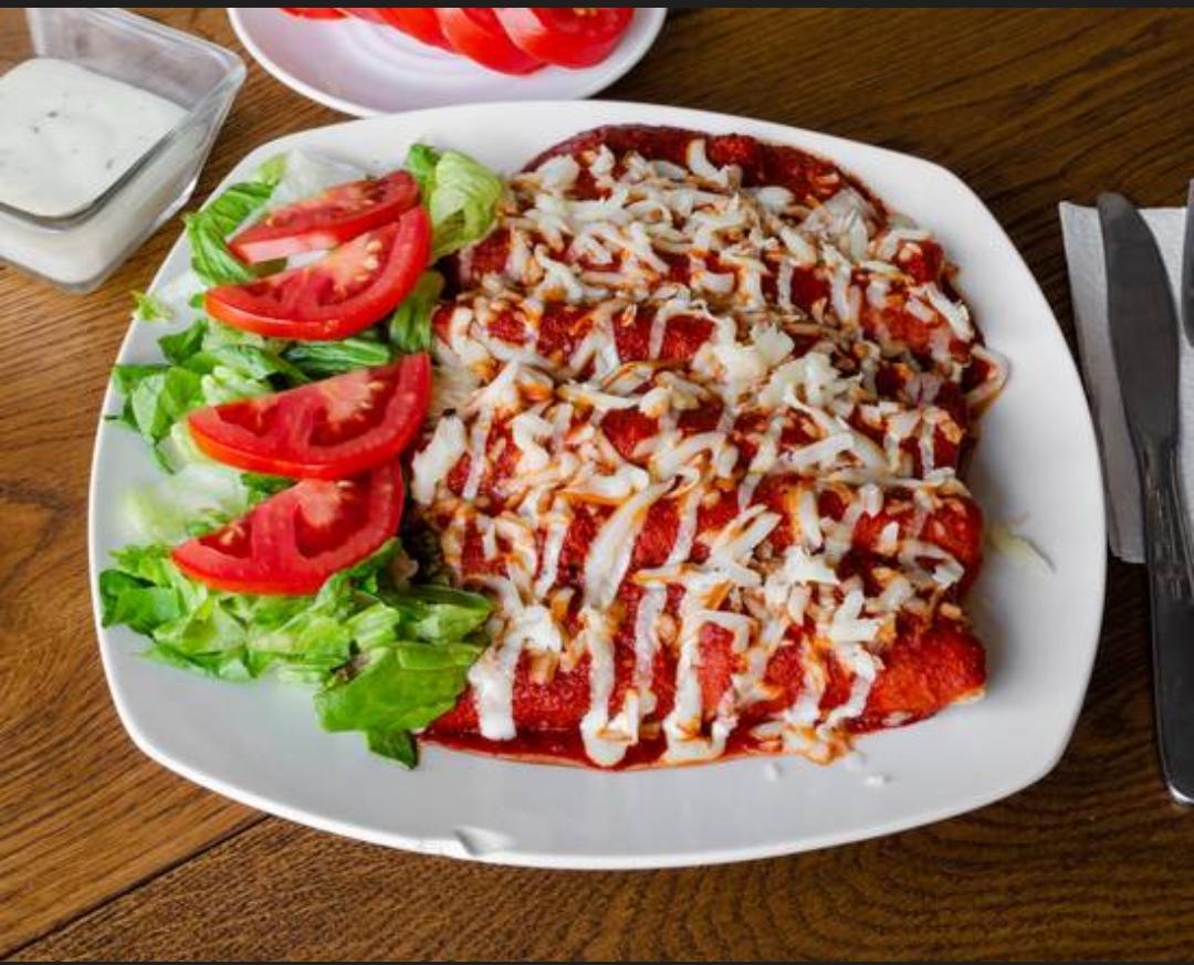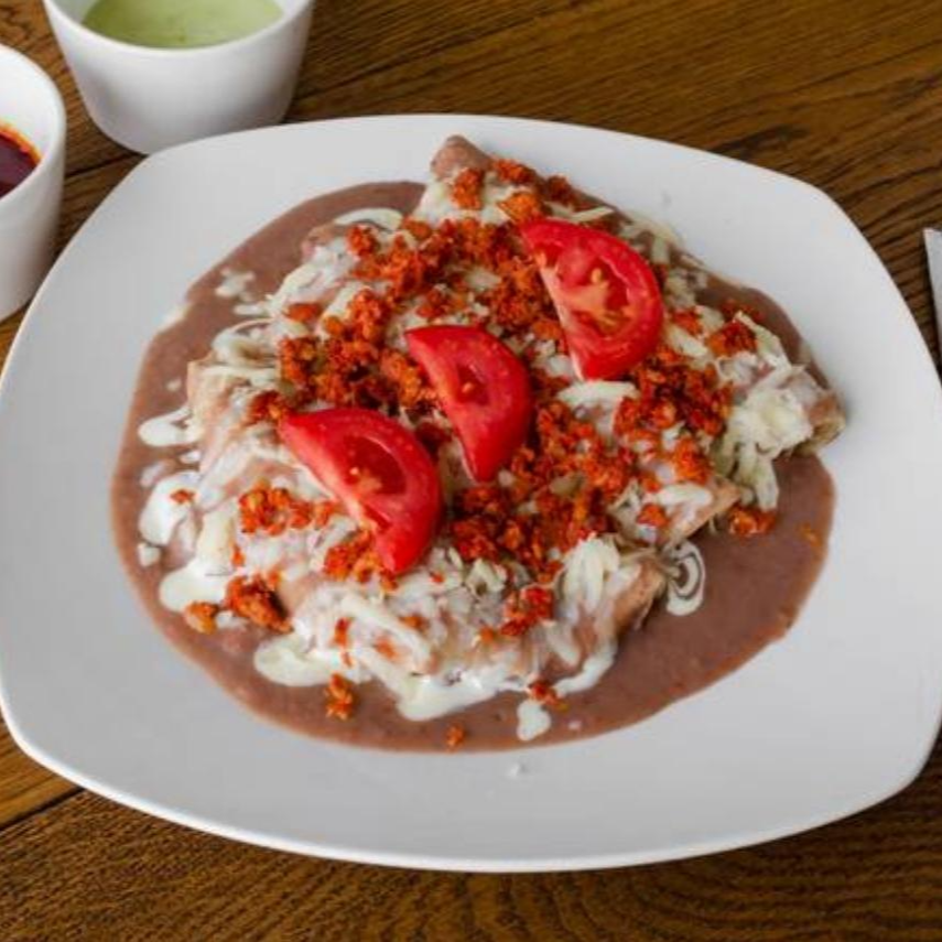 5 Tortillas de maíz, rellenas de pollo, bañadas en salsa, con queso y crema,a compañada con lechuga o jitomate.