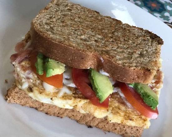 Pan integral con omelette de jamón, mayonesa y aguacate.
