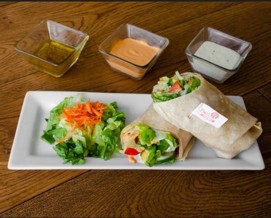 Tortilla de harina grande rellena de pollo, jamón o atún con lechuga, jitomate, pepino, aderezo ranch y chipotle.