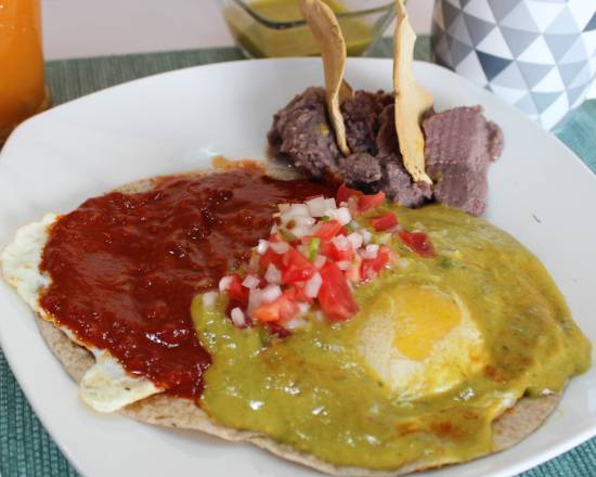 Sobre una tortilla enfrijolada, bañados en salsa verde y roja, acompañados de frijoles refritos y complemento a elegir.