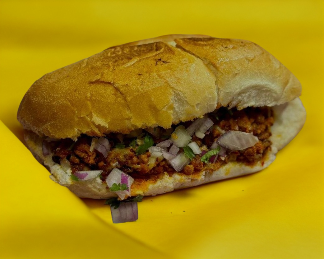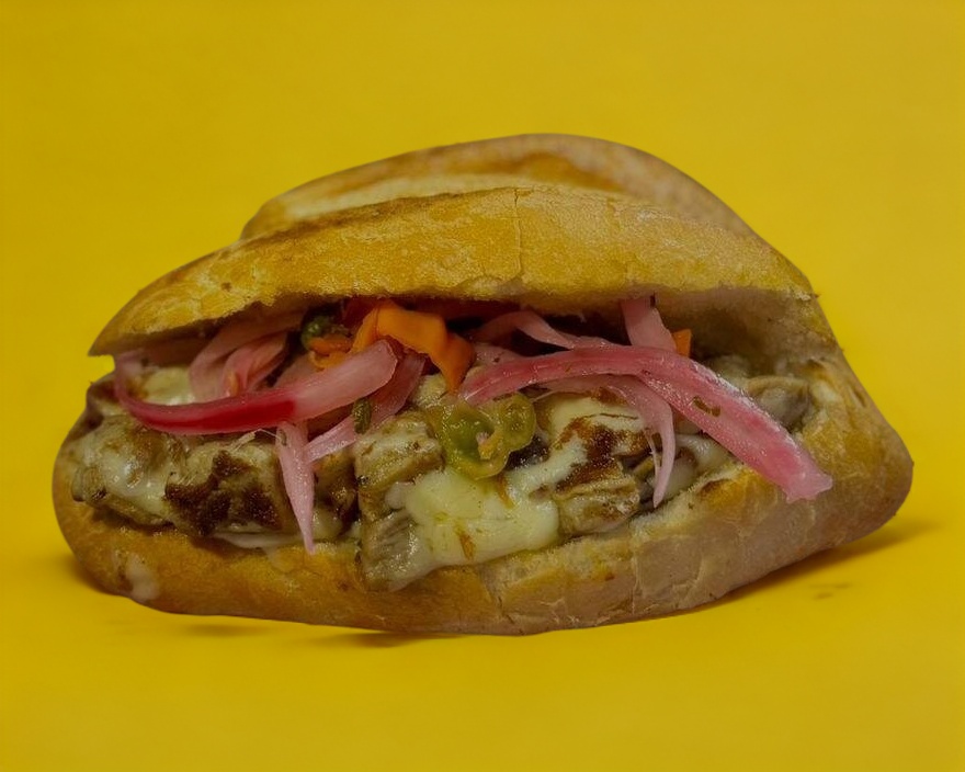 Bolillo, queso gratinado, carne de bistec, bañada en salsa guisada y una pequeña porción de frijoles.