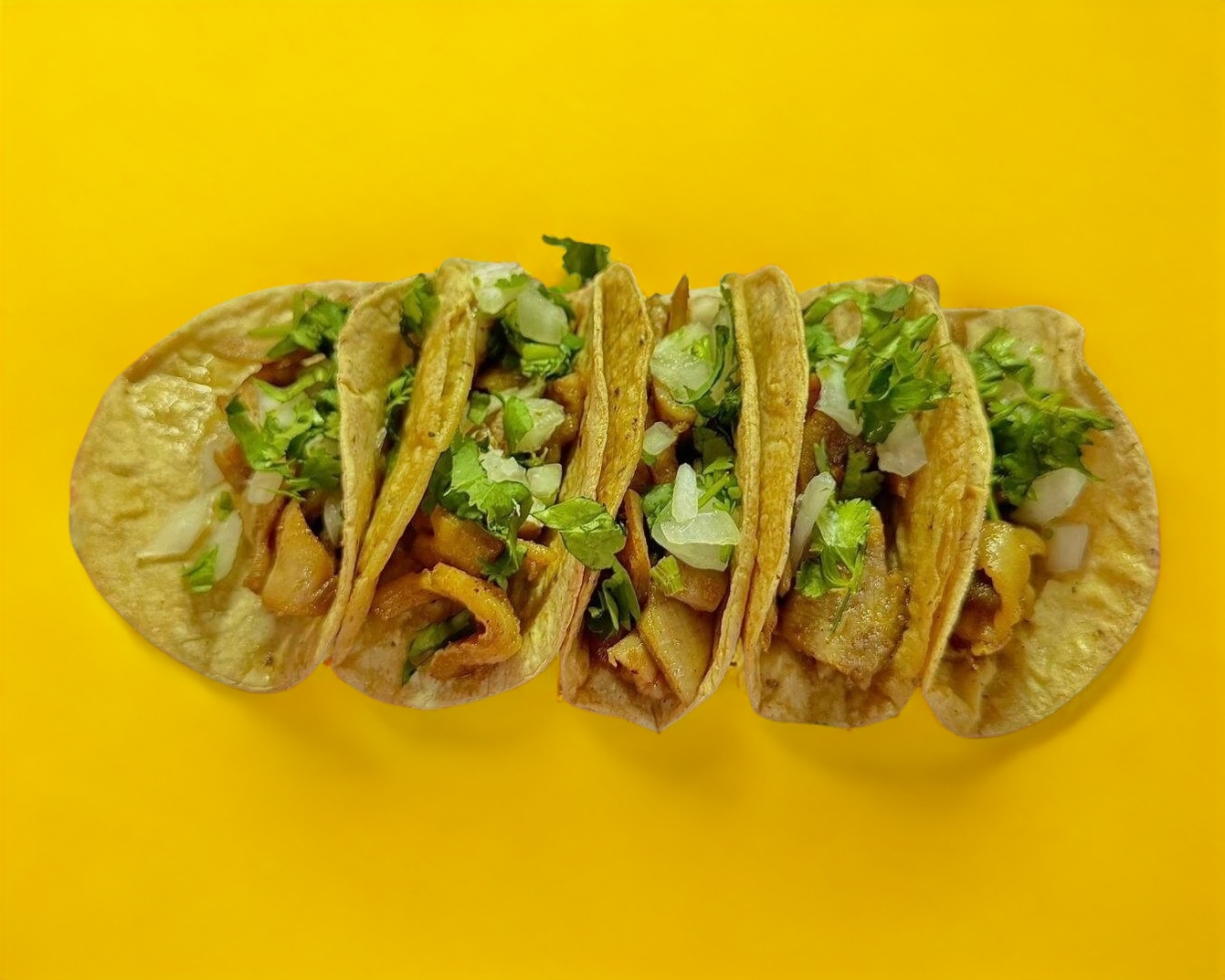 Orden con 5 tacos de carne al pastor acompañado de salsa y verduras.