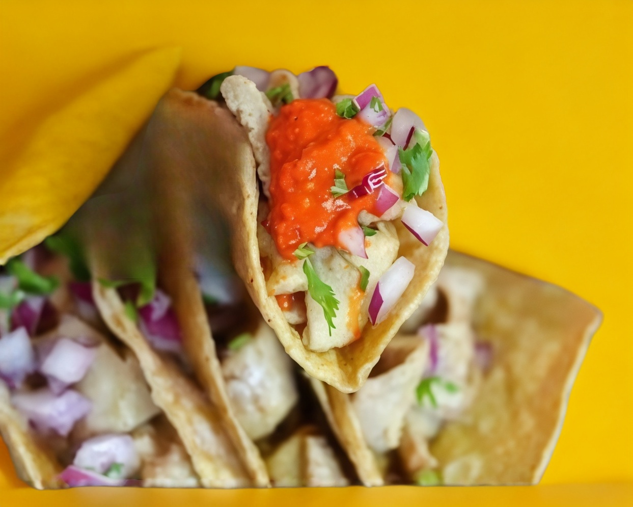Taco de Tripitas Doradas (50 hgramos por taco) Orden con 5 tacos tortilla de harina de maiz incluye salsa roja verde y chilena y verduras cebolla y cilantro