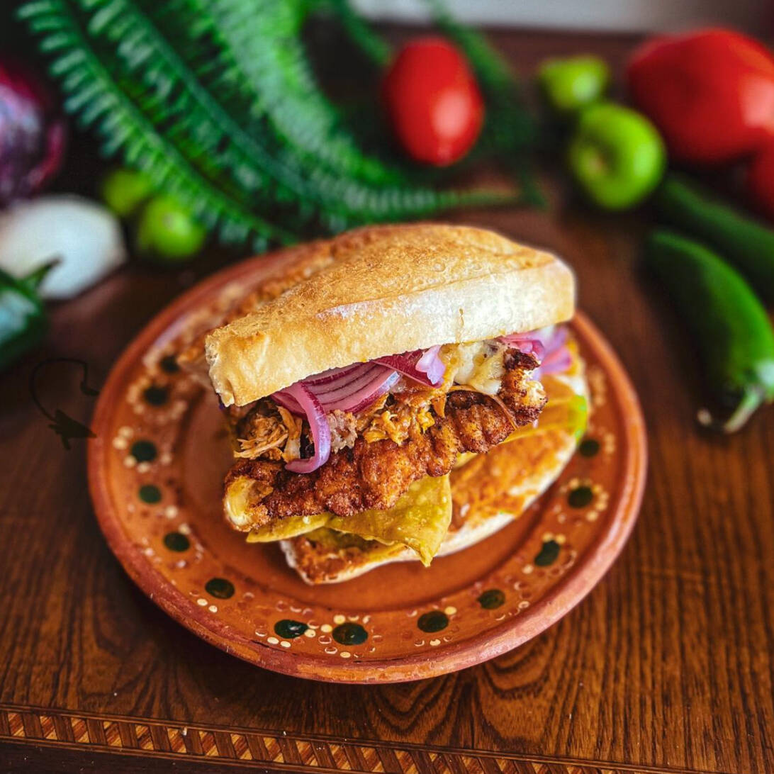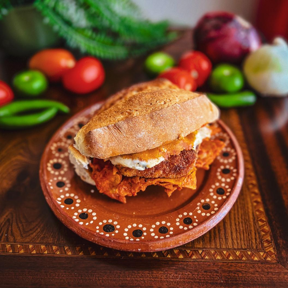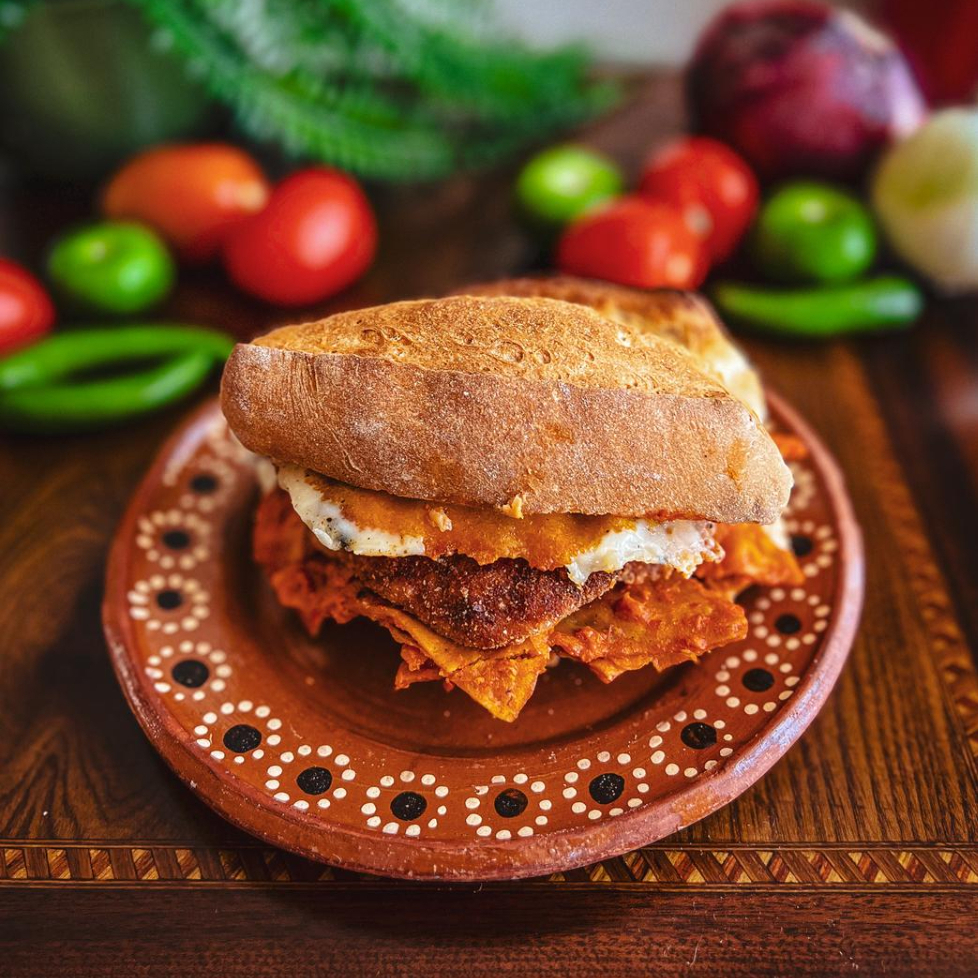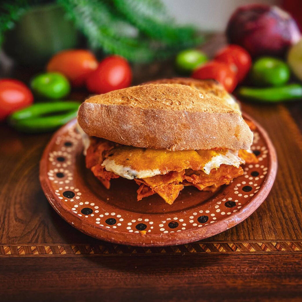 Chilaquiles rojos o verdes dentro de bolillo crujiente con frijoles, queso y crema. El clásico antojo mexicano en versión torta.
