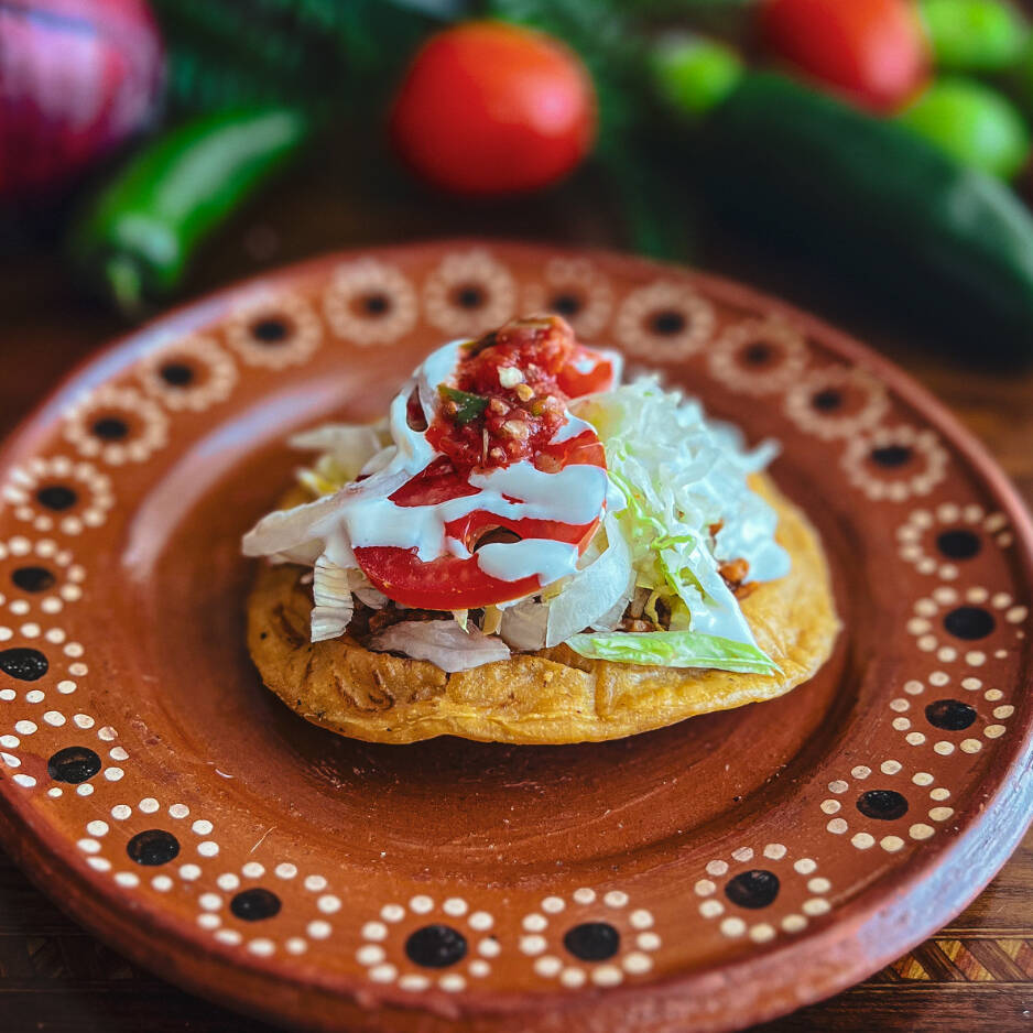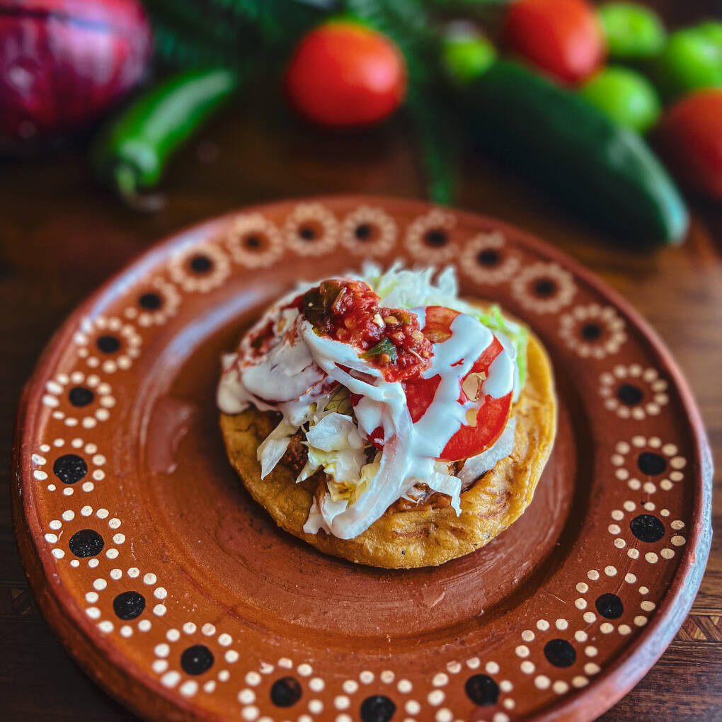 Torta de chilaquiles rojos o verdes con cochinita pibil, frijoles, queso y crema. Sabor yucateco que combina perfecto con la salsa.
