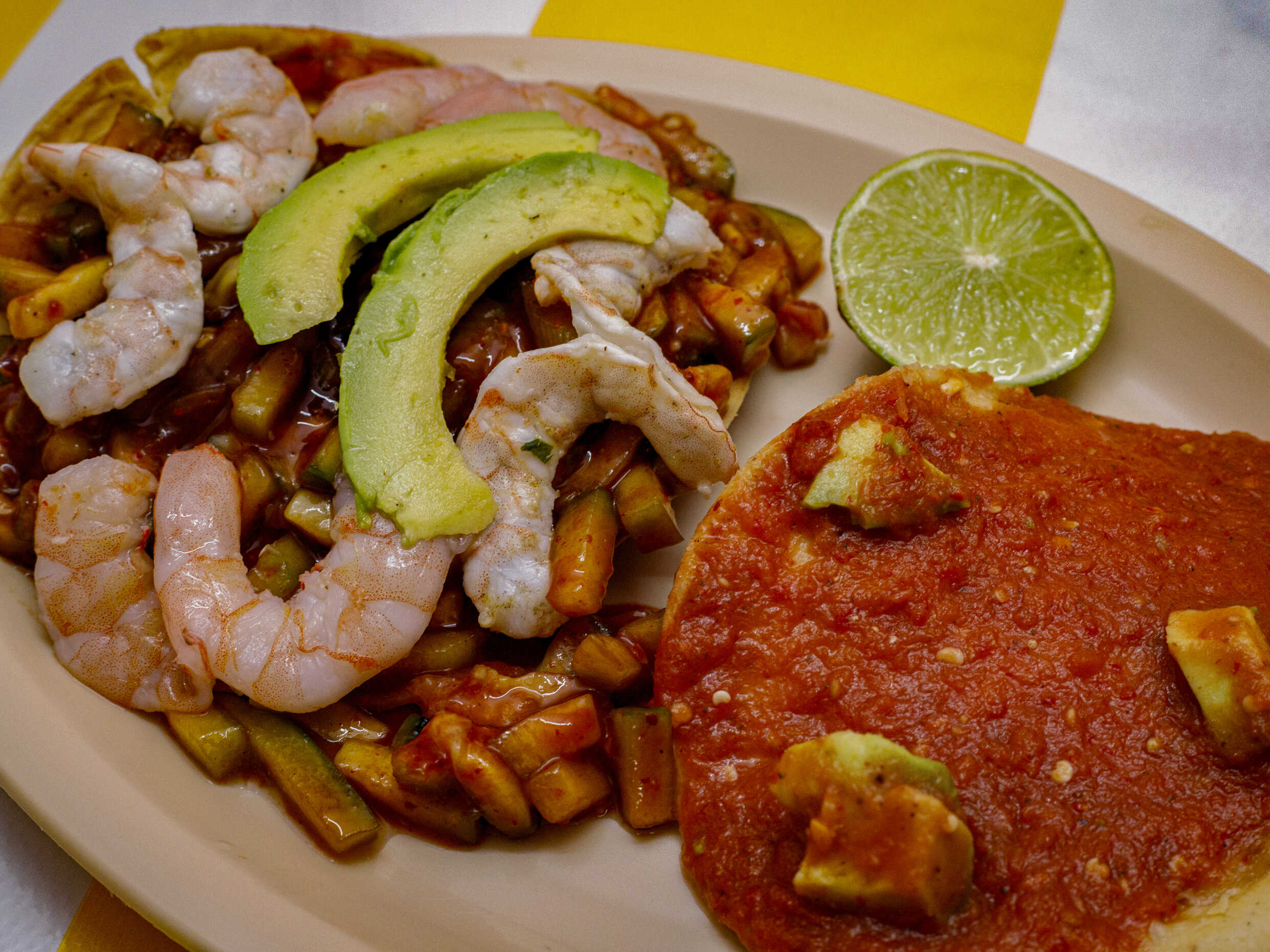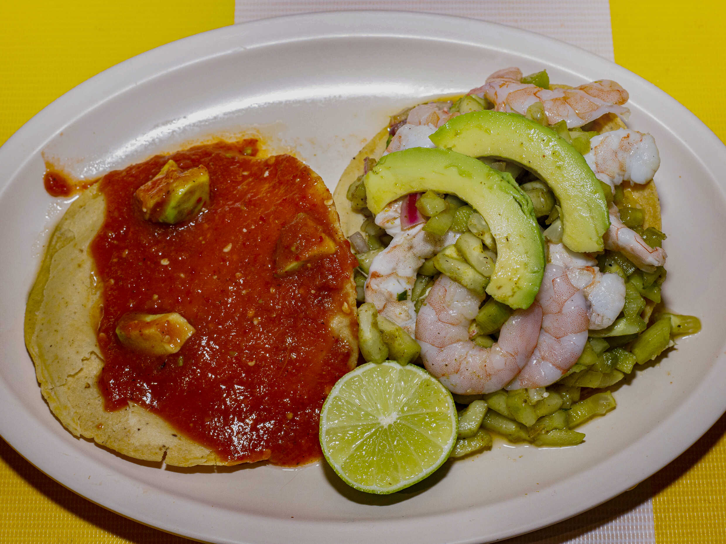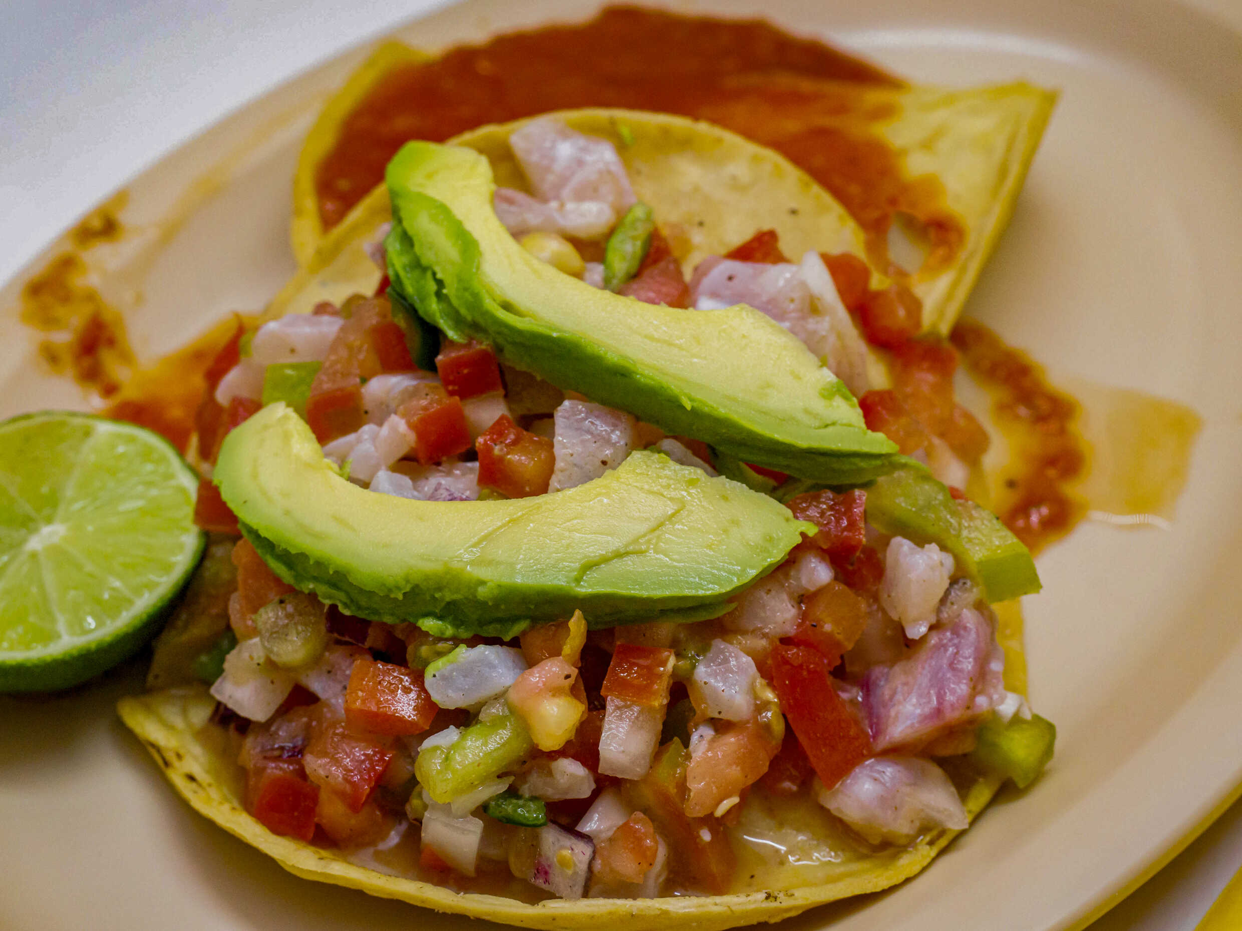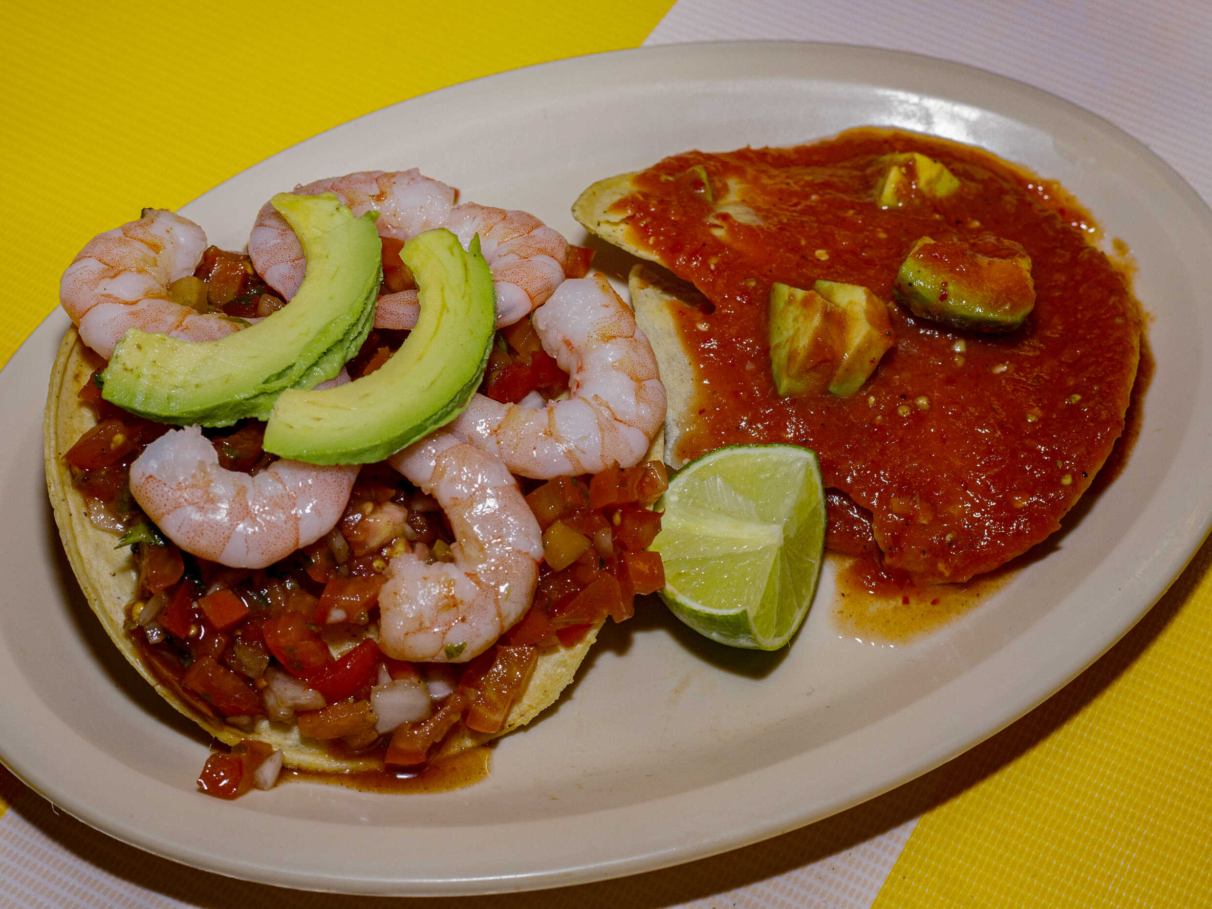 3 Camarón , 2 tostadas aguacate en la parte de arriba ( opcional ), limon (opcional ) salsa