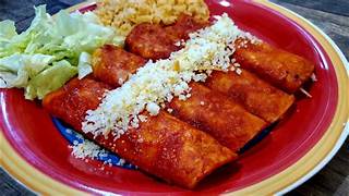 2 enfrijoladas rellenas de queso, acompañadas de arroz y ensalada