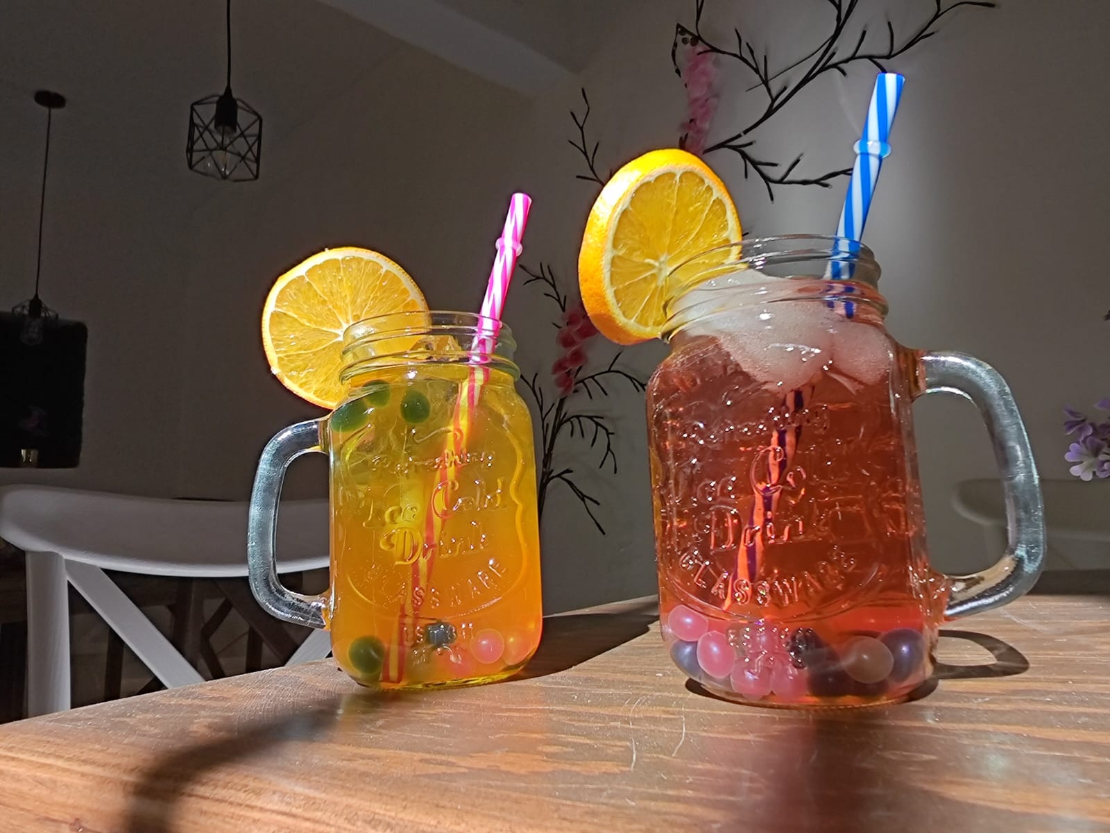 Soda italiana sabor a mandarina cereza o frutos rojos con perlas explosivas frutales.