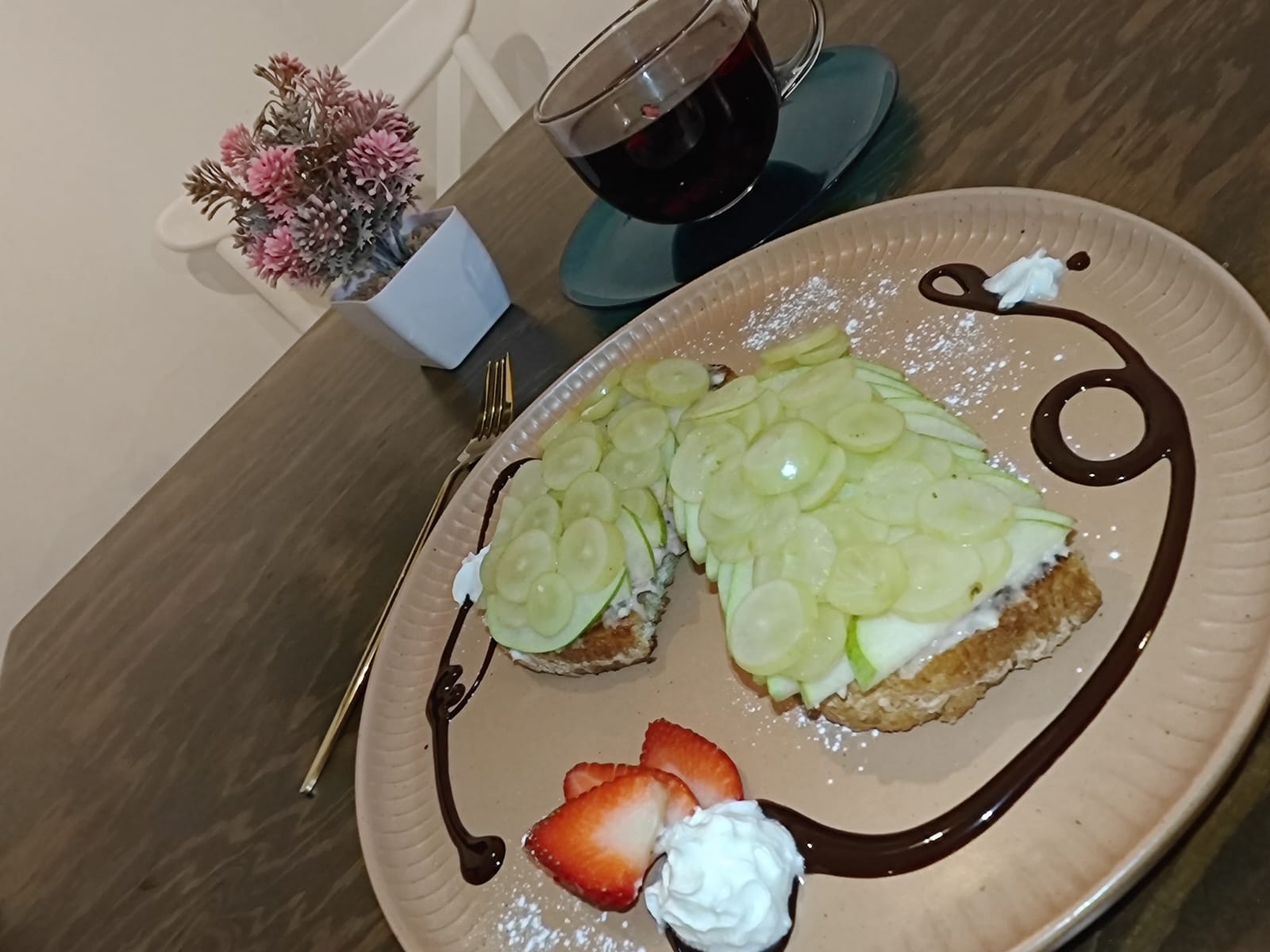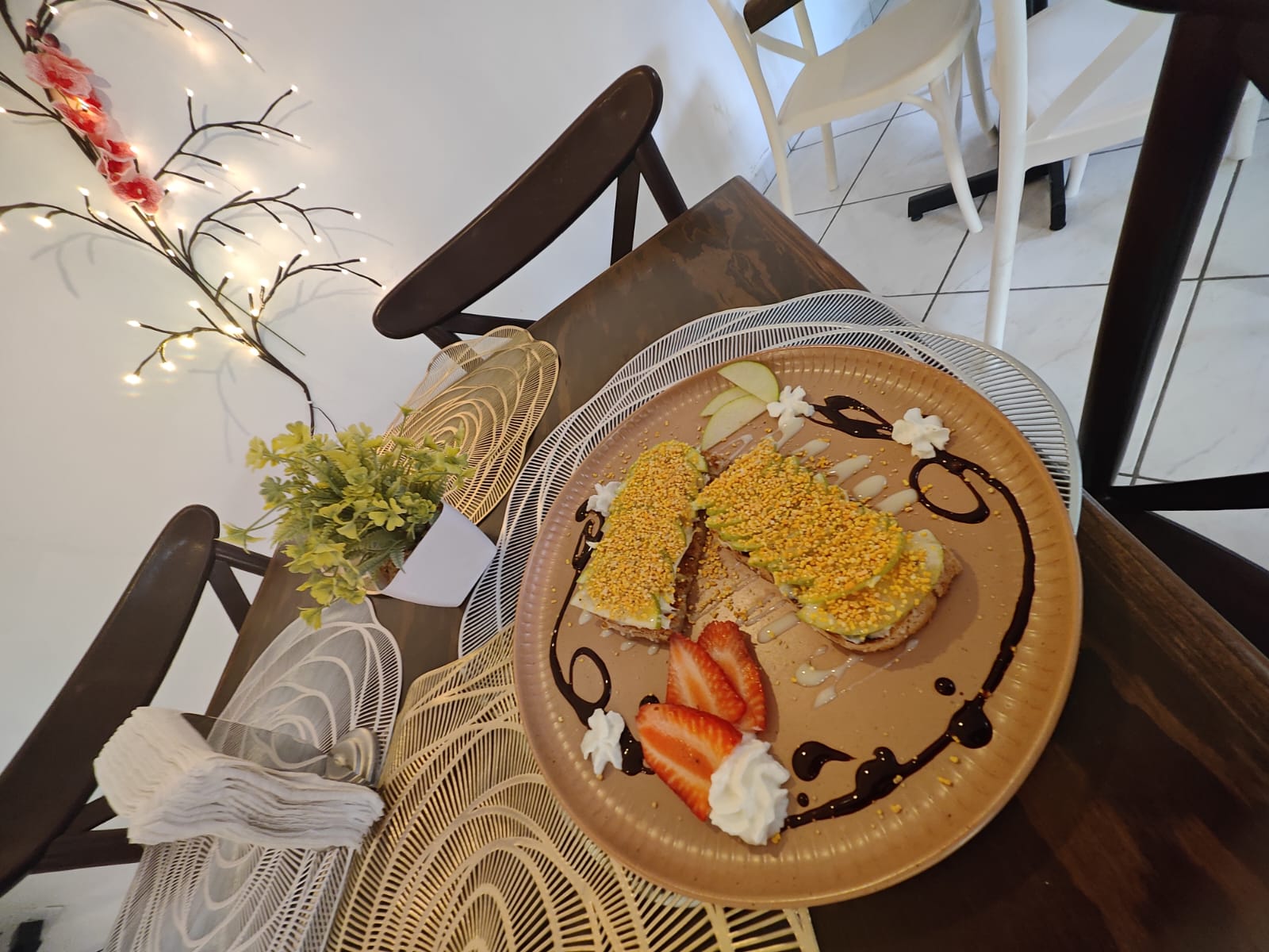 Delicioso pan brioche recién horneado, tostado a la mantequilla, bañado en compota de manzana y pera. Acompañado de crema de yogurt griego.