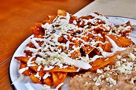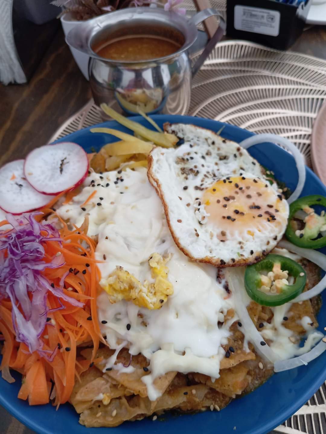 Chips de tortilla y huevos ahogados en salsa de chile y tomate, rajas, rábano, col morada, queso, aguacate y crema.