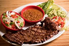 Arrachera acompañada de nopal asado, frijoles negros, ensalada y cebollita cambray.