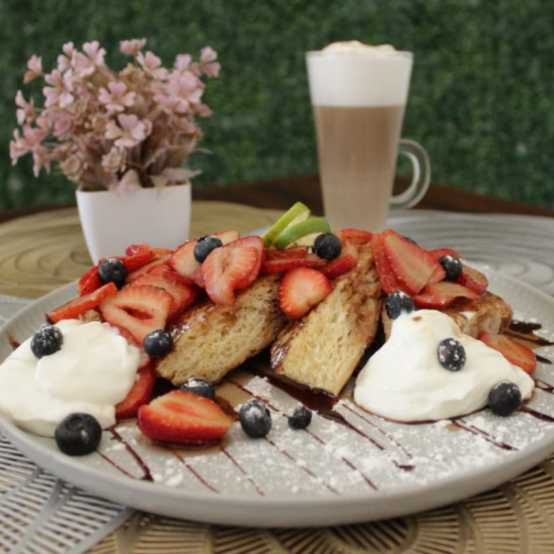 Delicioso pan brioche recién horneado, tostado a la mantequilla, bañado en compota de fresa y frutos rojos. Acompañado de crema de vainilla.