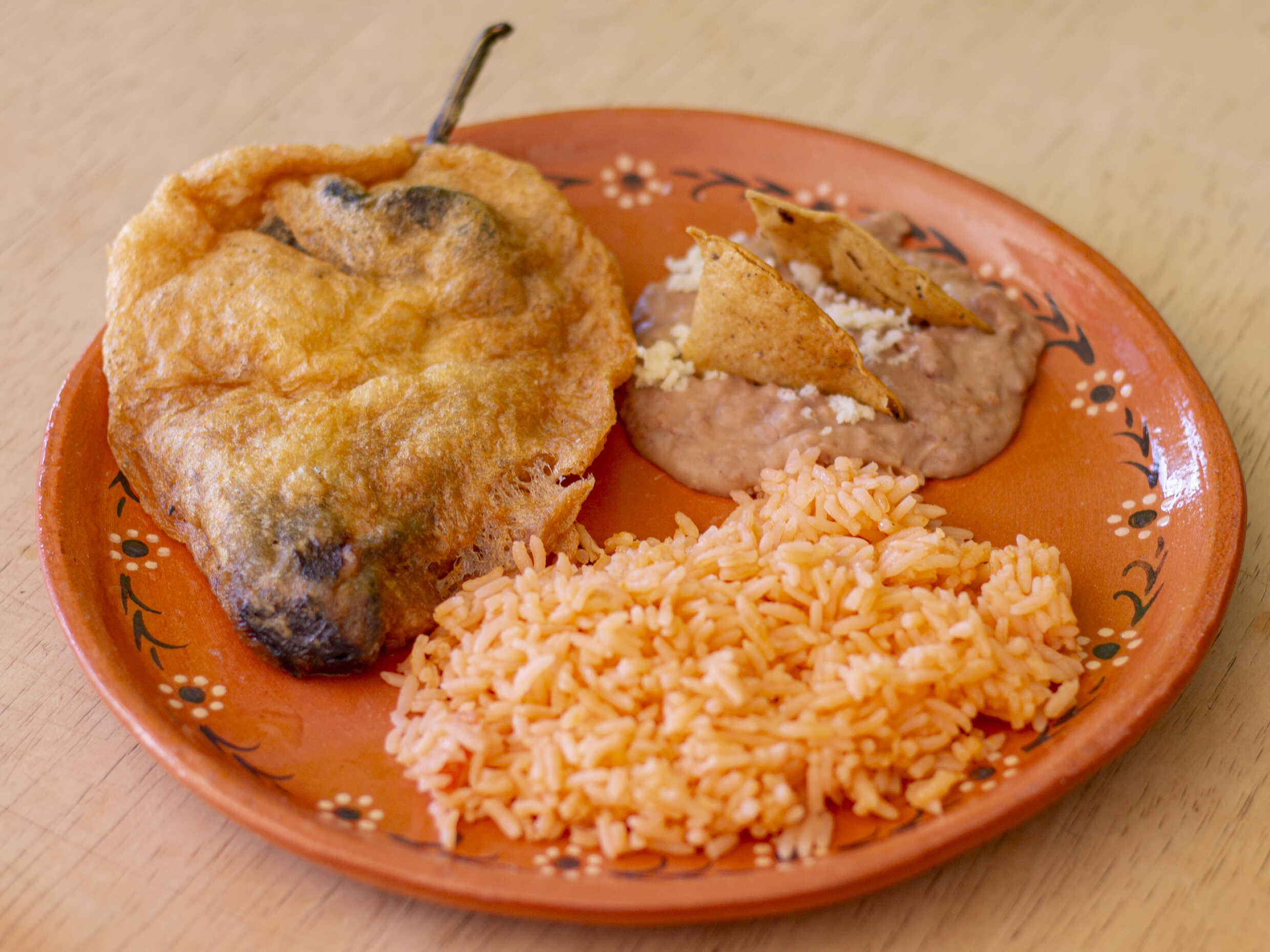 Platillo de chile de relleno, arroz, frijoles y tortillas