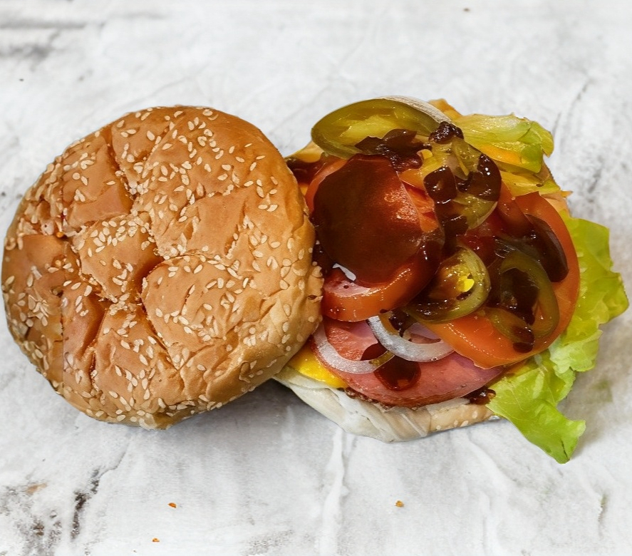 Pan, mayonesa, moztasa, carne, queso, jamón, salsa BBQ, lechuga y verduras.