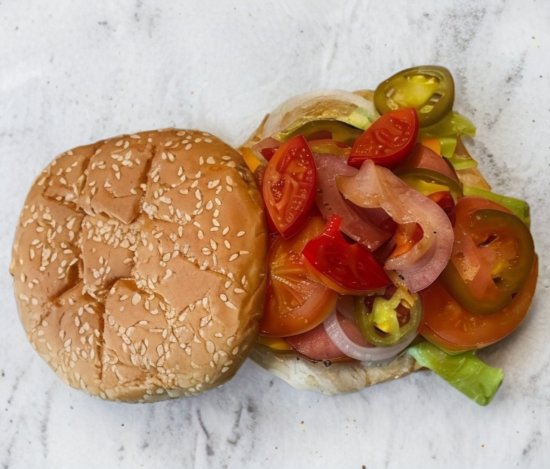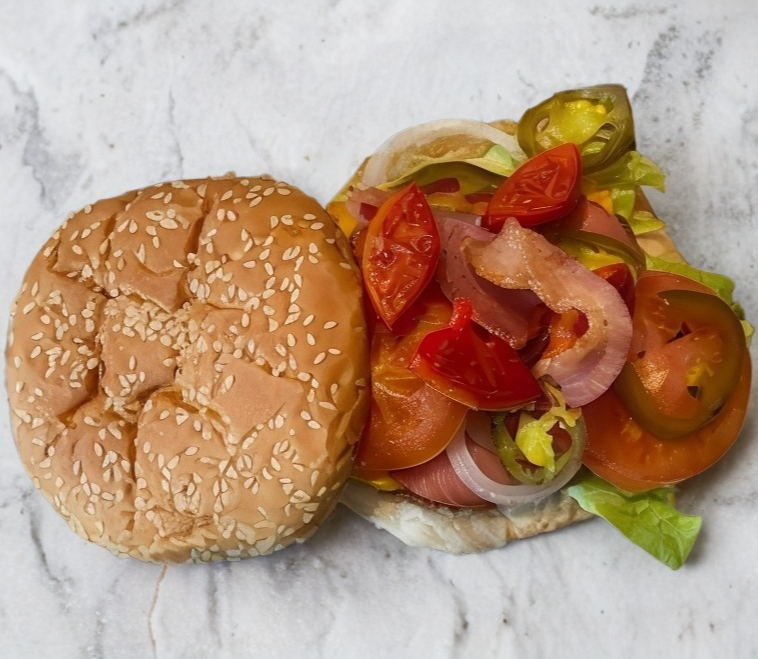 Pan, mayonesa, carne, moztasa, queso ,tocino, jamón, lechuga y verduras.