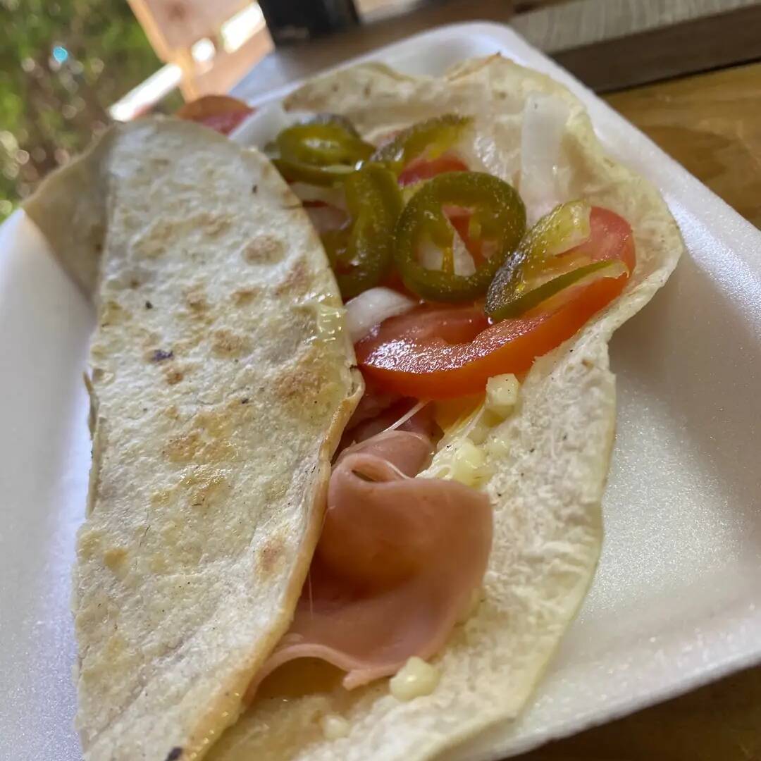 Tortilla de harina, queso cheda, queso americano, jamon, jitomate, cebolla, chiles, mayonesa
