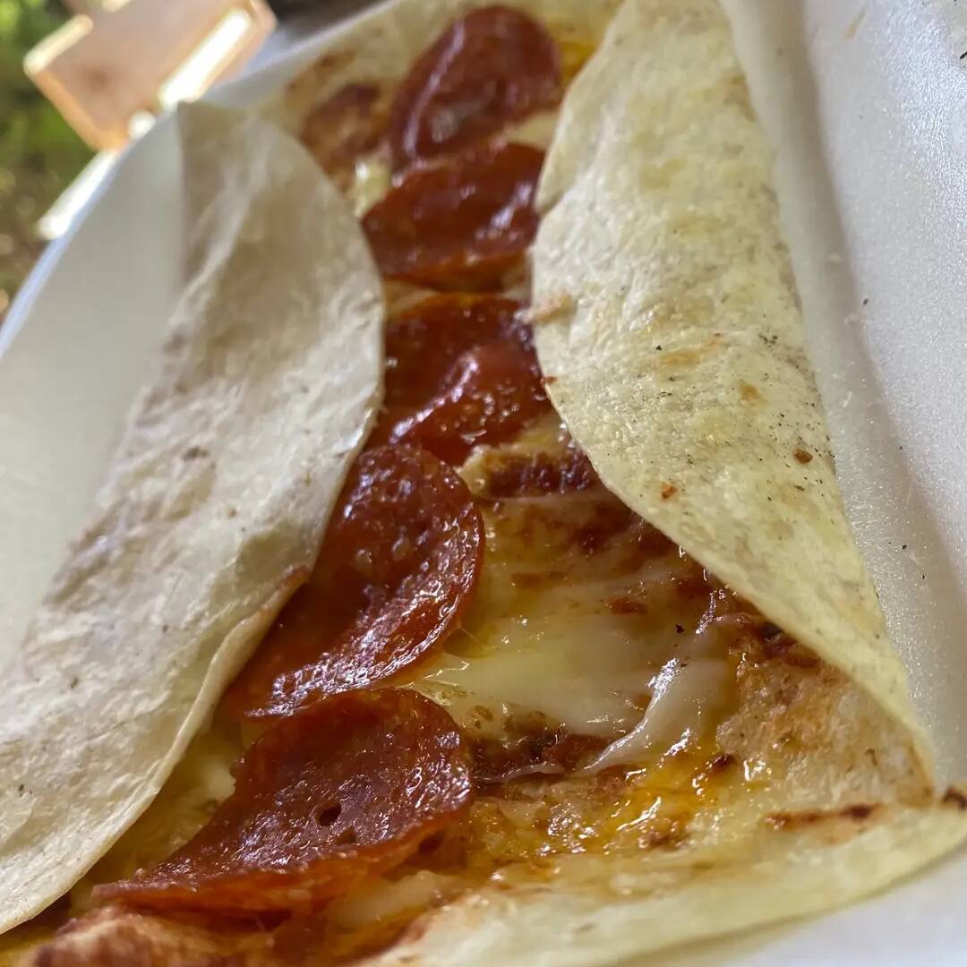 Tortilla de harina, queso fundido, salsa de tomate, peperoni, catsup