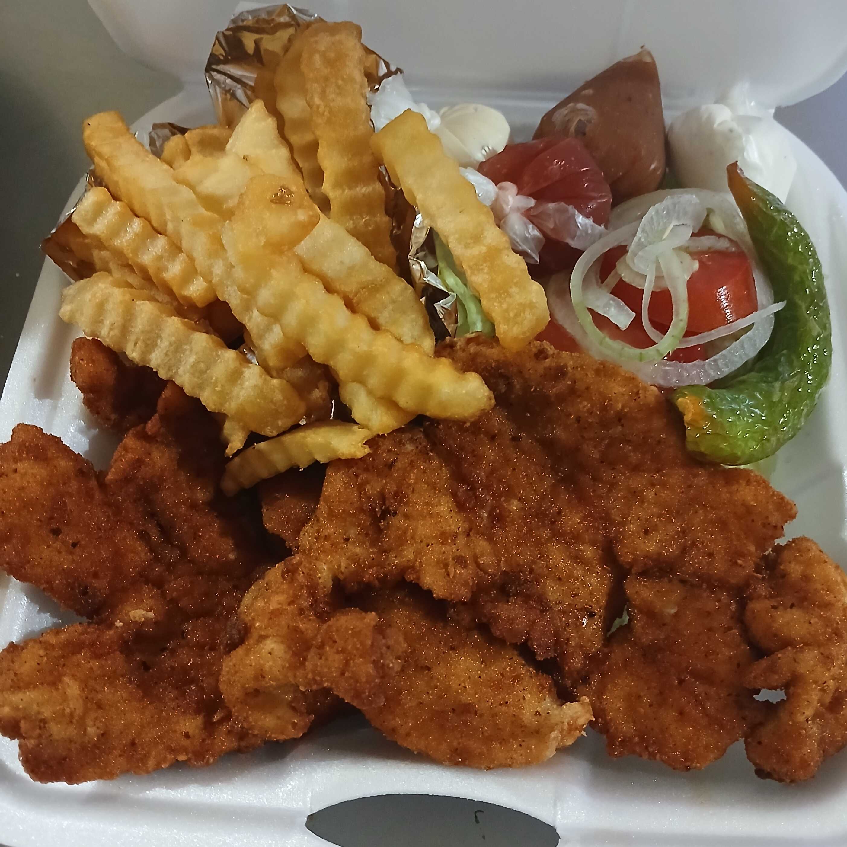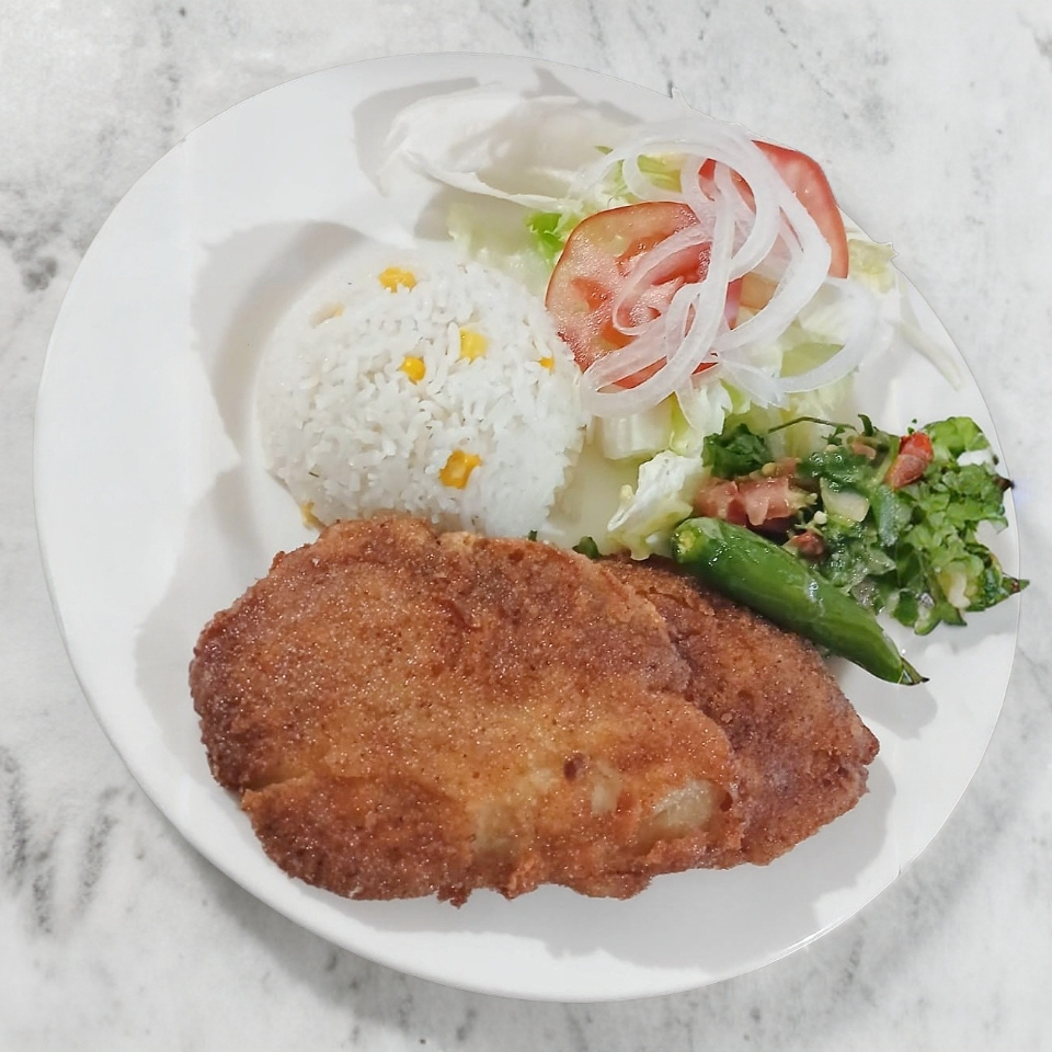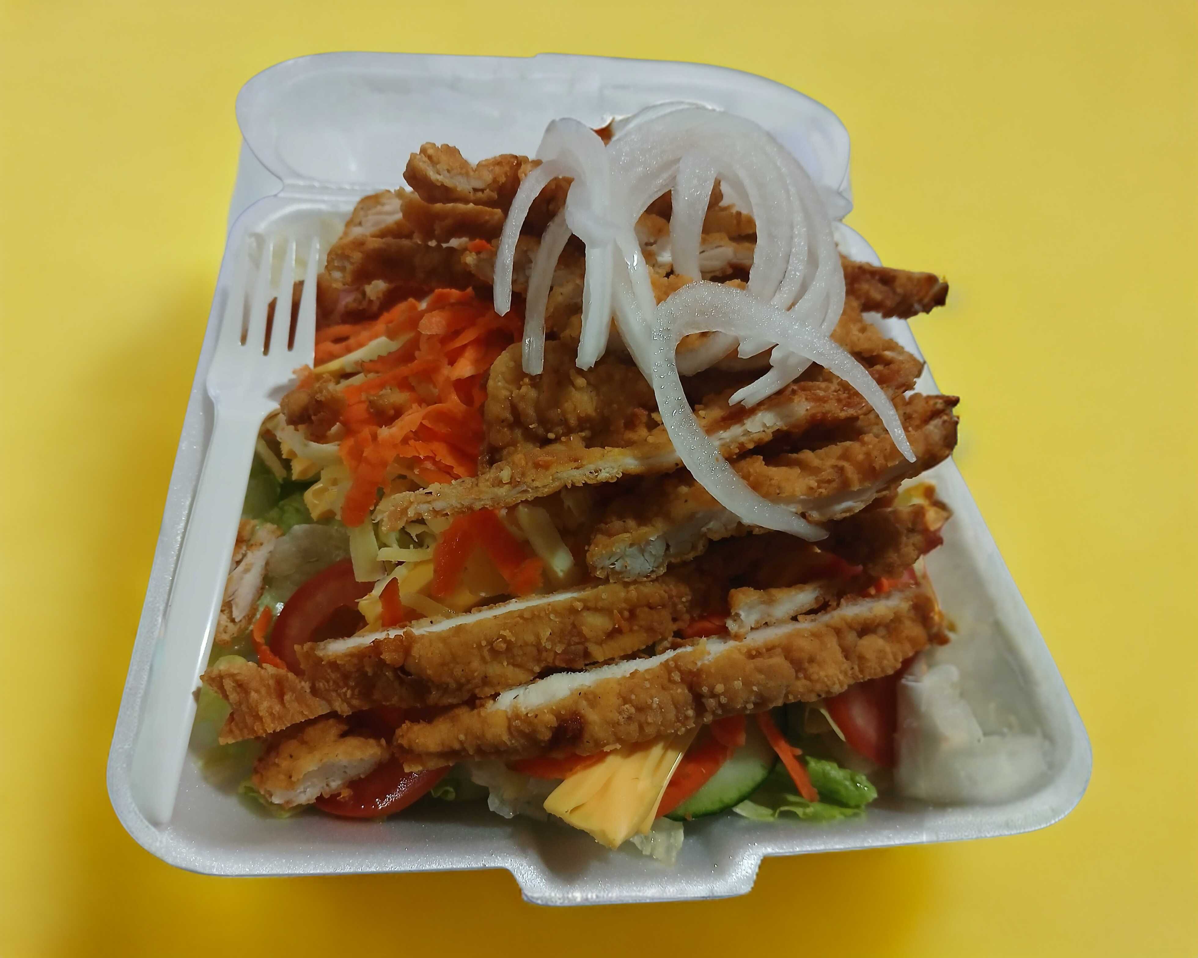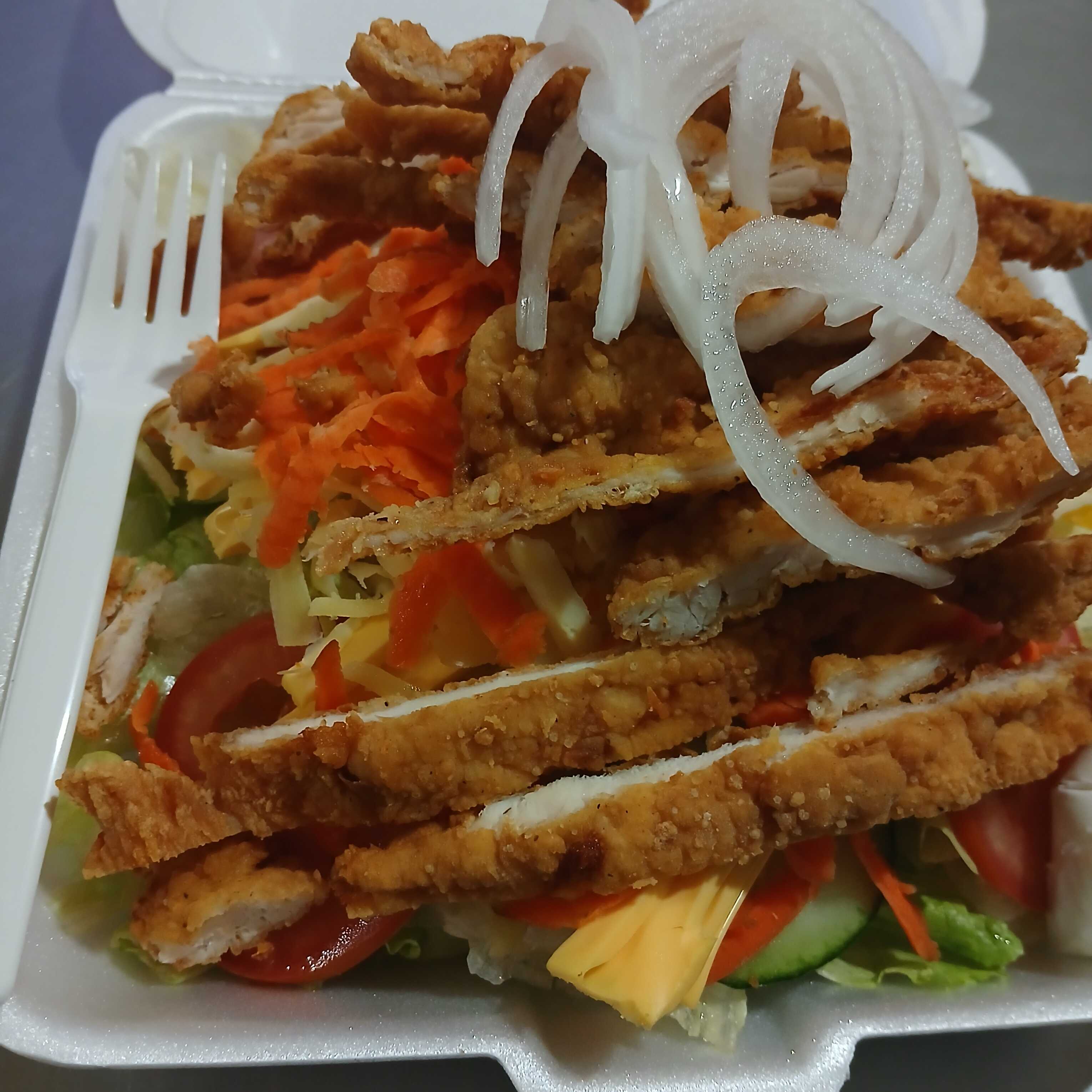 Pechuga de pollo frita, lechuga, pepino, morrón, jitomate, queso amarillo y blanco, zanahoria,cebolla aderezo ranch.