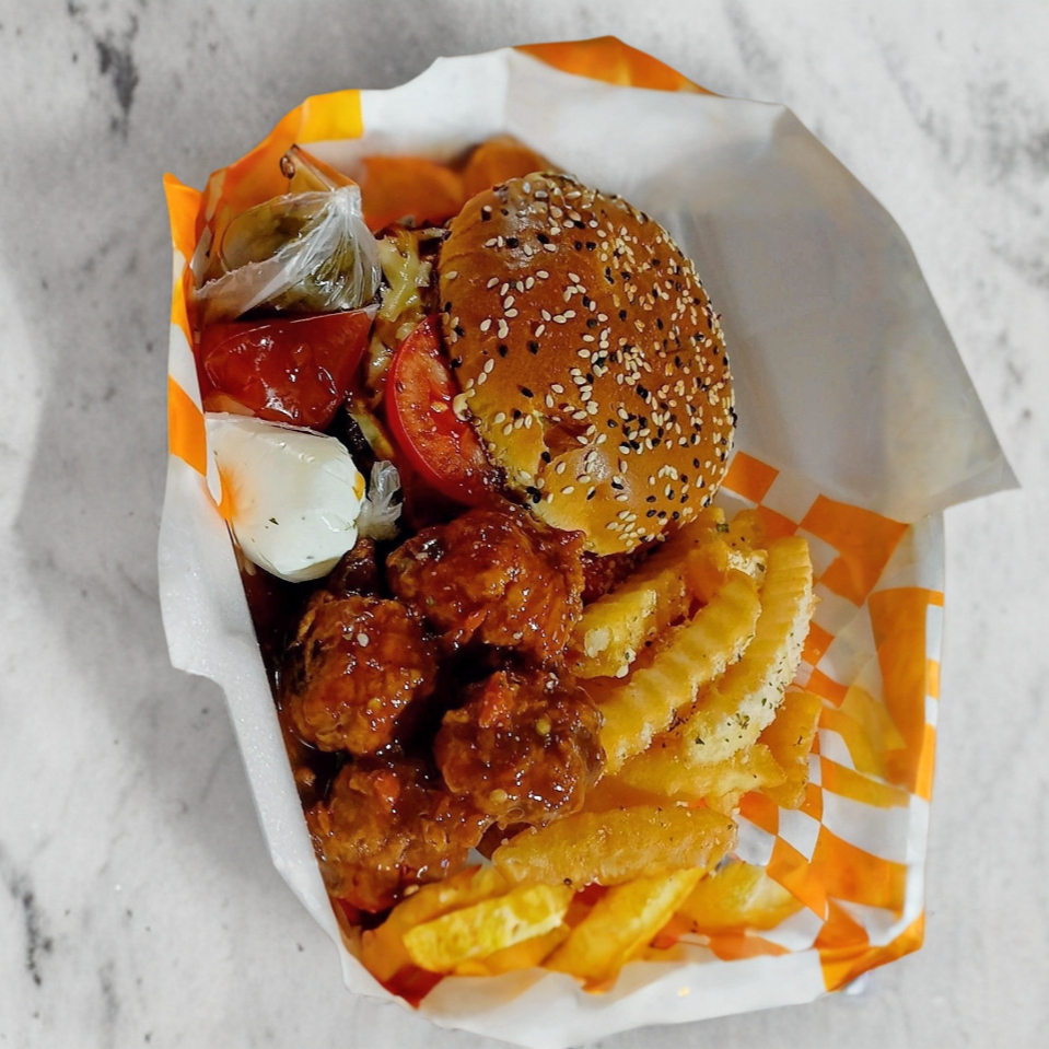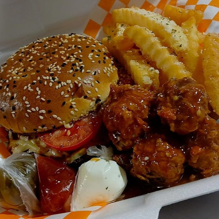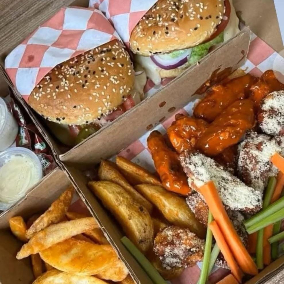 Incluye 2 hamburguesas, alitas, boneles, papas gajo o francesas y agua fresca 1lt.