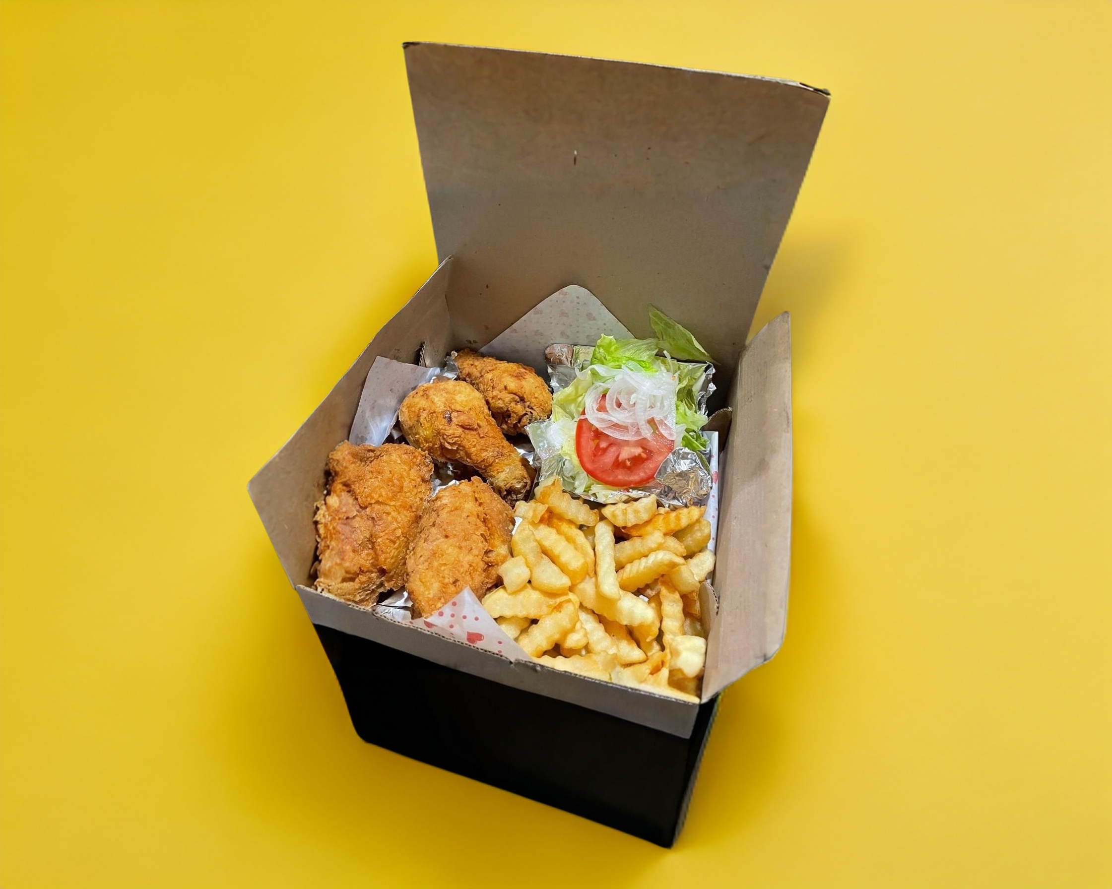 4 piezas de pollo frito,ensalada, papás fritas,2piezas de pan. Aderezos.